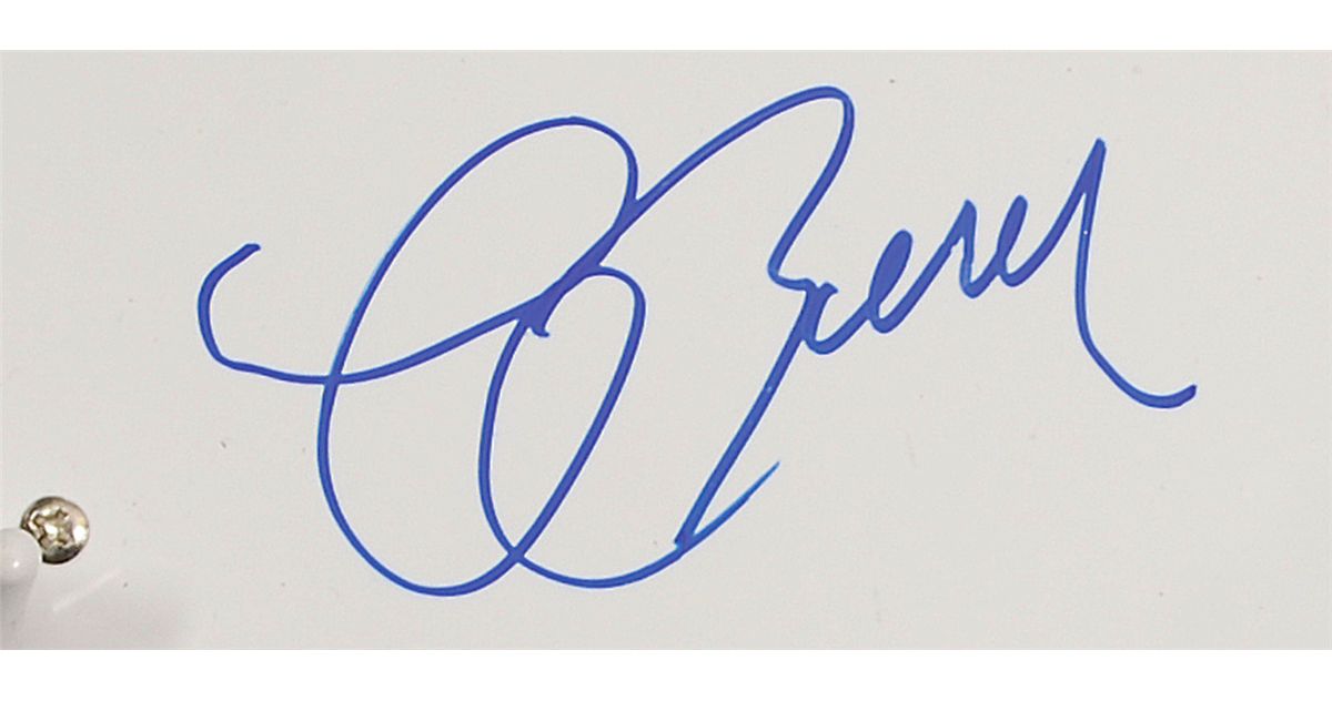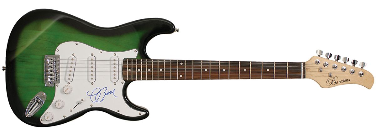Green-bodied Barcelona ‘stratocaster-style’ electric guitar, signed on the white pickguard in blue felt tip by Berry. In fine condition. Oversized.