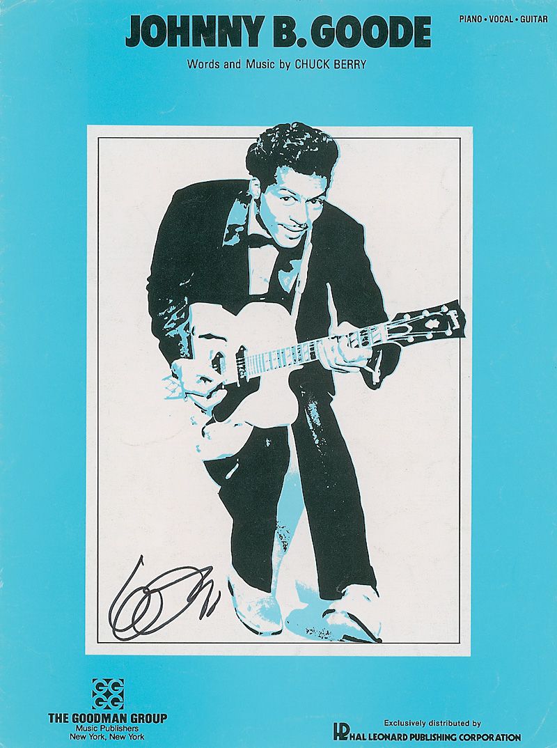 Sheet music to ‘Johnny B. Goode,’ 9 x 12, three pages, signed on the cover in black felt tip. Scattered light creases, otherwise fine condition.