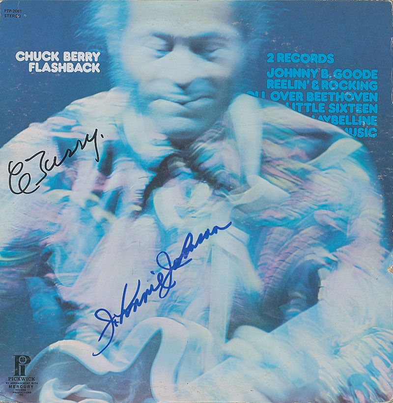 Flashback album signed on the front cover in black felt tip by Berry and also signed in blue felt tip by Johnnie Johnson. In fine condition, with scattered light surface wear and a few dings to edges. The record is included.