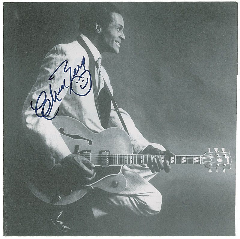 Neat 10.75 x 11 book photo of a young Berry duck-walking with his guitar, signed in blue felt tip. In fine condition.
