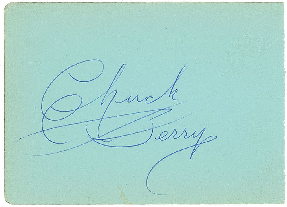 Vintage ballpoint signature, “Chuck Berry,” on a light green 5 x 3.75 album page. In fine condition.