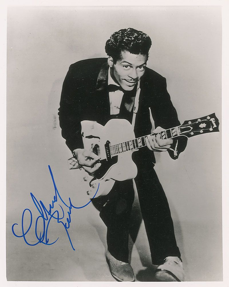 Glossy 8 x 10 photo of a young Berry posing with his guitar, signed in blue felt tip. In very fine condition.