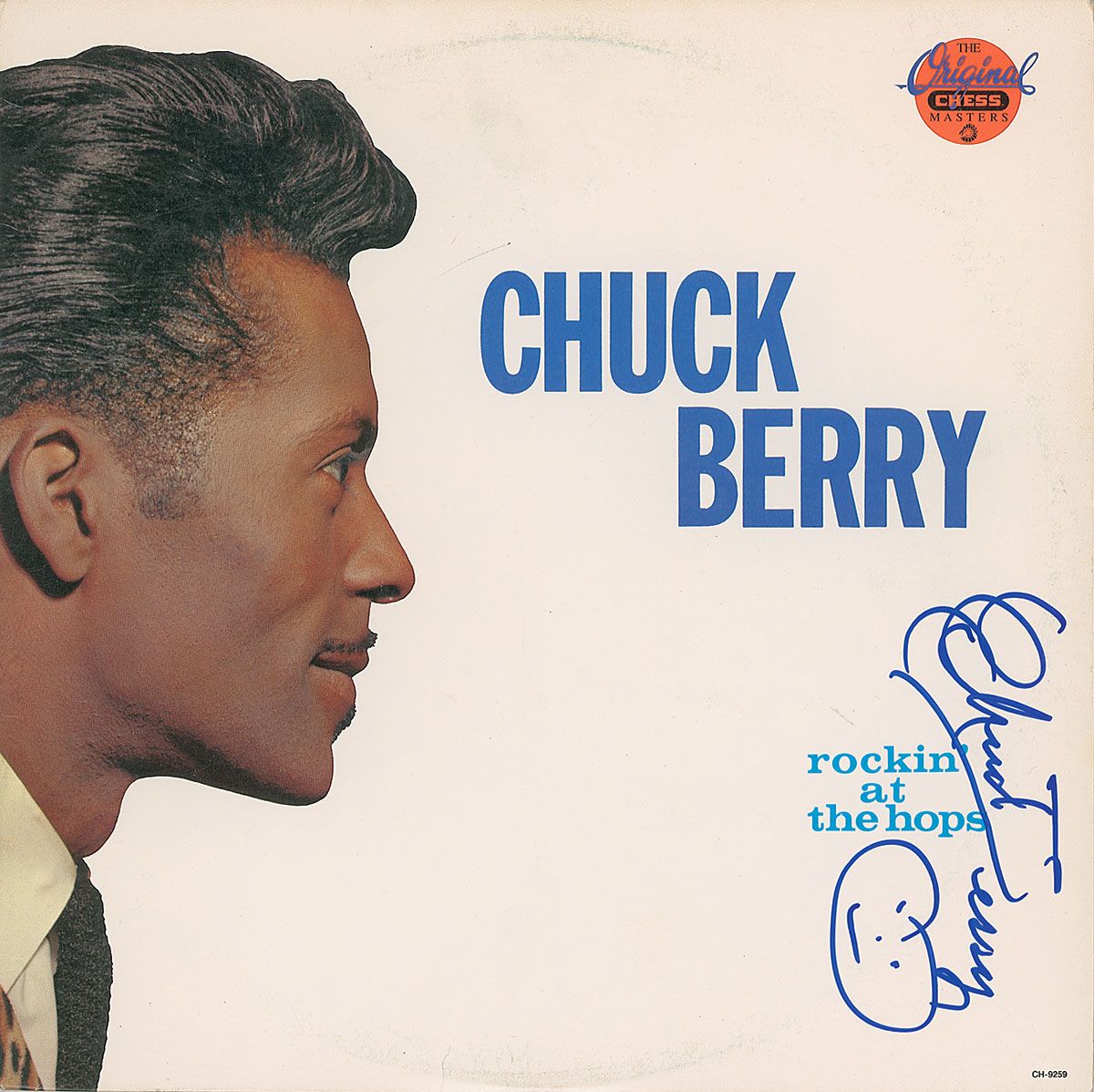 Rockin’ at the Hops album signed vertically on the front cover in blue felt tip, with Berry adding a happy face under his signature. In fine condition, with mild ‘ring of wear’ to front cover. The record is included. Accompanied by a full letter of authenticity from Roger Epperson/REAL.