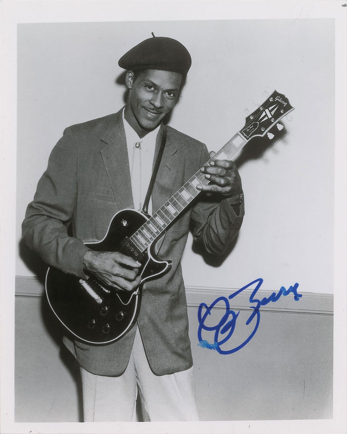 Glossy 8 x 10 photo of Berry wearing a beret and holding his Gibson Les Paul, signed in blue felt tip. In fine condition, with a smudge to his first initial.