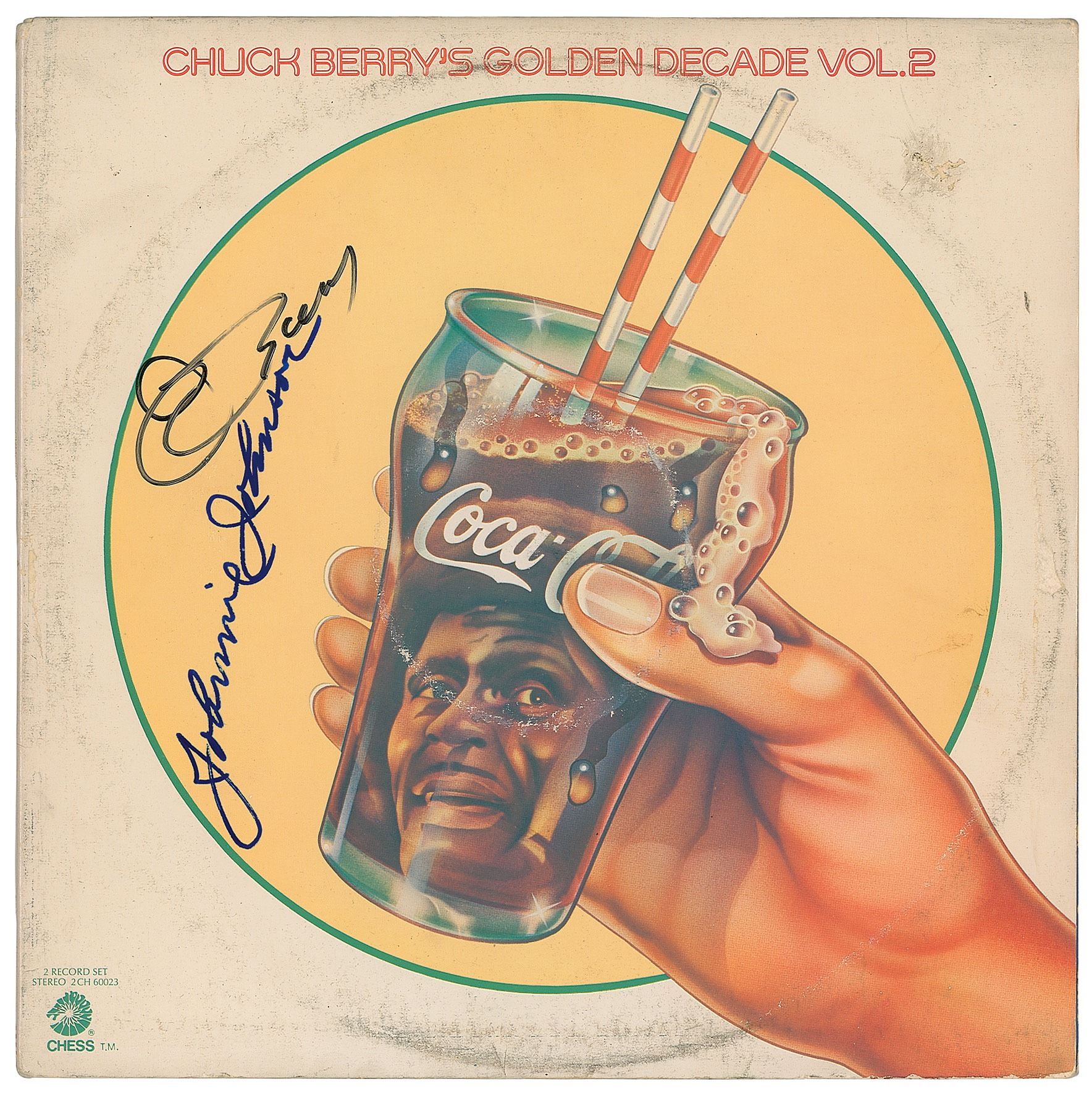 Chuck Berry's Golden Decade Vol. 2 album signed on the front cover in black felt tip by Chuck Berry and in blue felt tip by Johnnie Johnson. In very good to fine condition, with scuffing and price sticker residue. The record is not included.