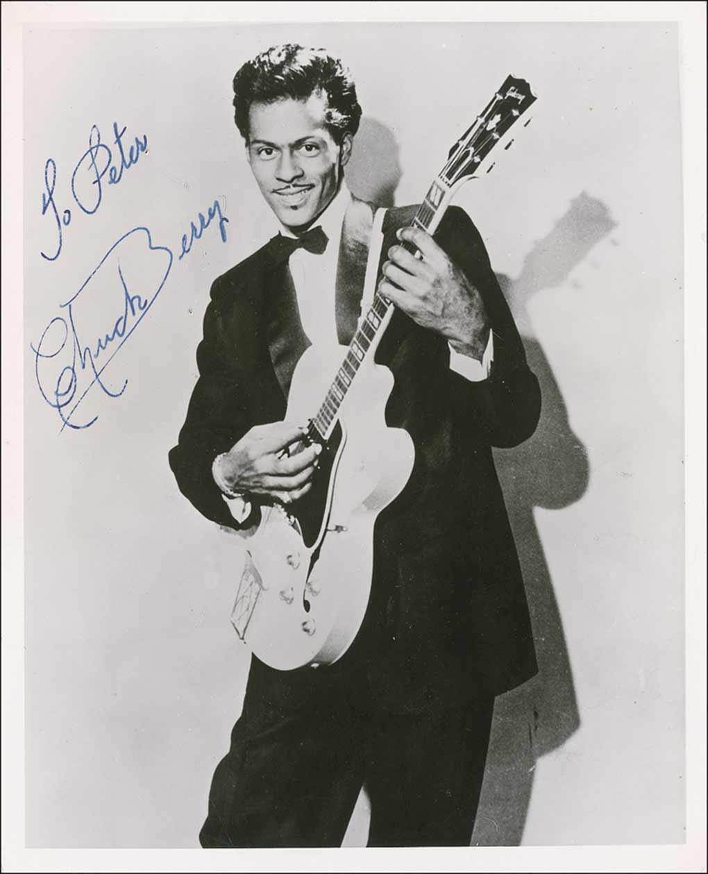 Vintage glossy 8 x 10 photo of a young Berry playing his guitar, signed and inscribed in fountain pen “To Peter, Chuck Berry.” In very good condition, with some scattered irregular adhesion to signature and inscription, and some scattered light surface marks and creases.