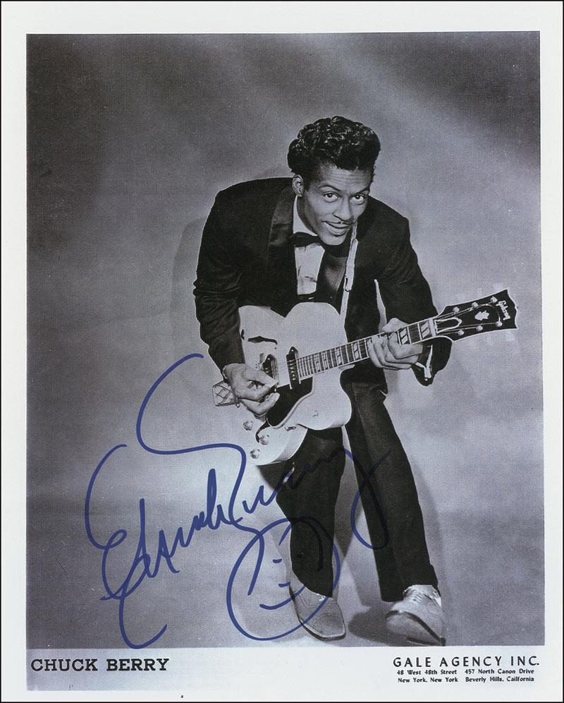 Cardstock 8 x 10 photo of Berry playing his guitar, signed in blue felt tip, adding a happy face under his signature. In very fine condition. Pre-certified Roger Epperson/REAL and RRAuction COA.
