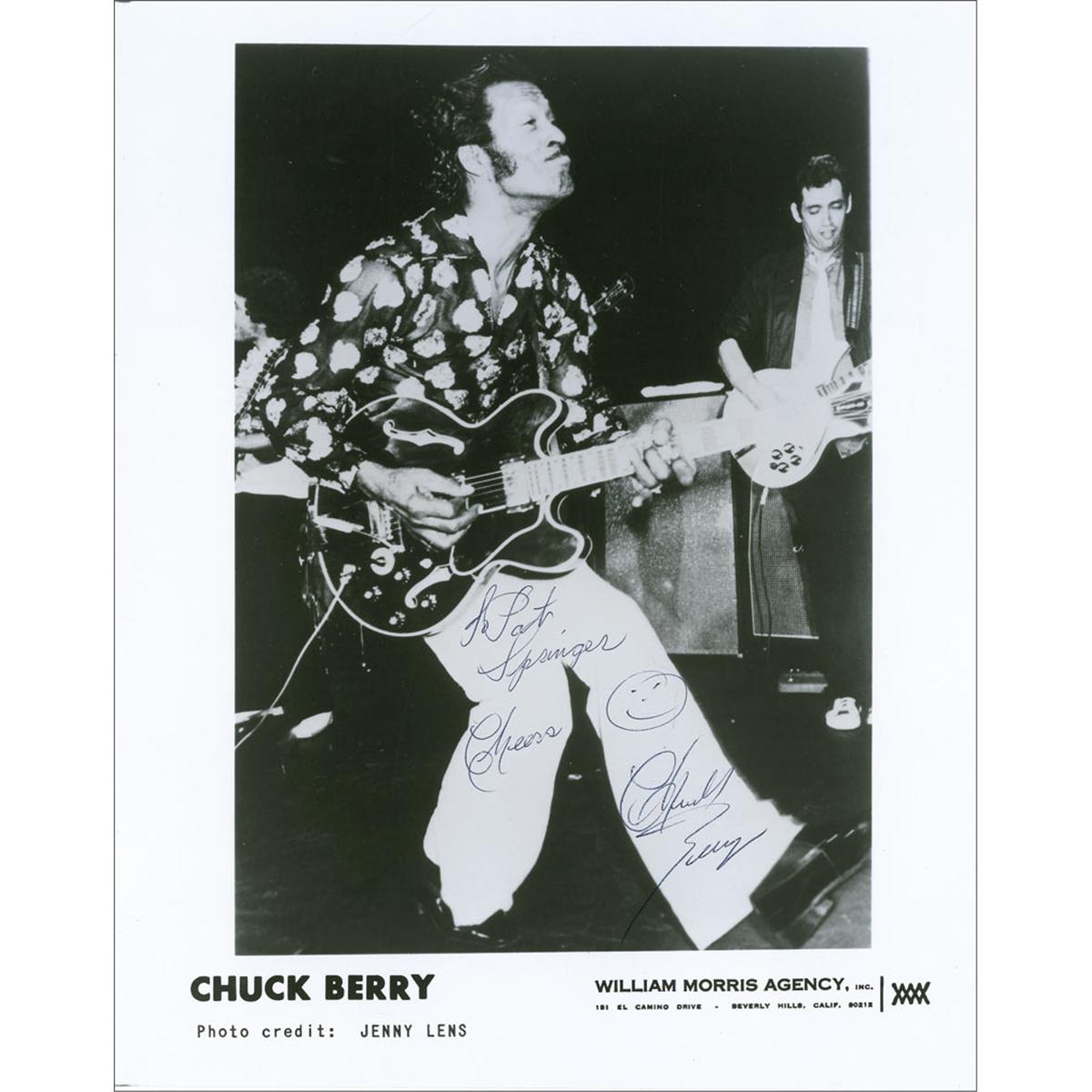 Glossy 8 x 10 publicity photo of Berry on stage, signed and inscribed in black ballpoint “To Pat Springer, Cheers, Chuck Berry,” adding a small happy face. In very fine condition.