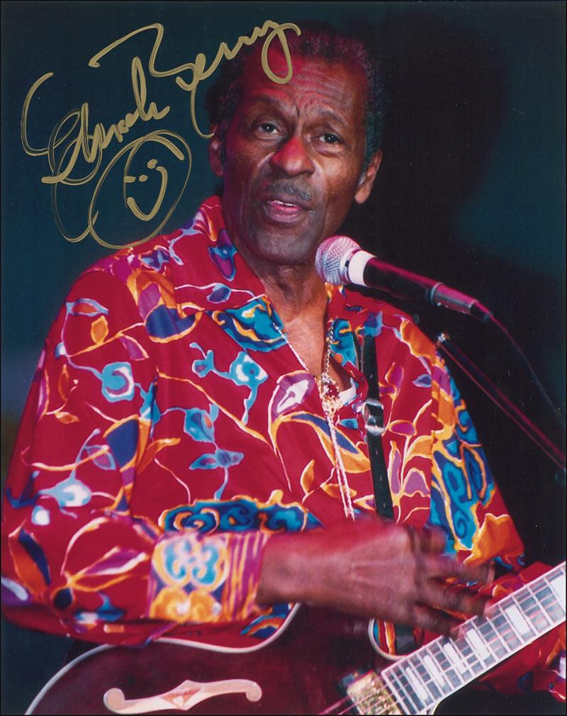 Color glossy 8 x 10 photo of Berry performing, signed in gold ink, adding a small happy face under his signature. In very fine condition.