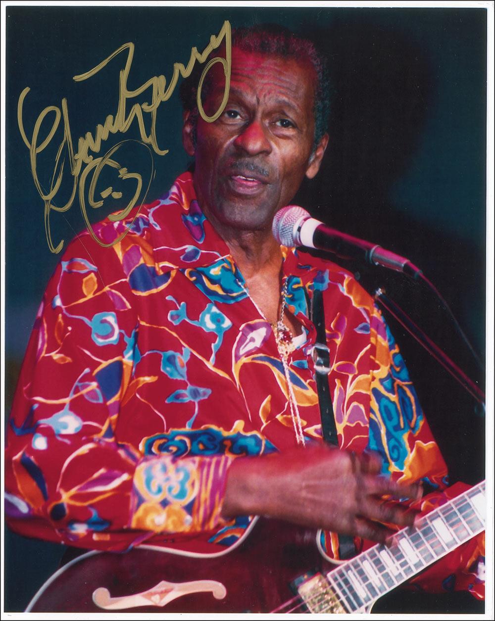 Color glossy 8 x 10 photo of Berry performing on stage, signed in gold ink, adding a happy face underneath his signature. In very fine condition.