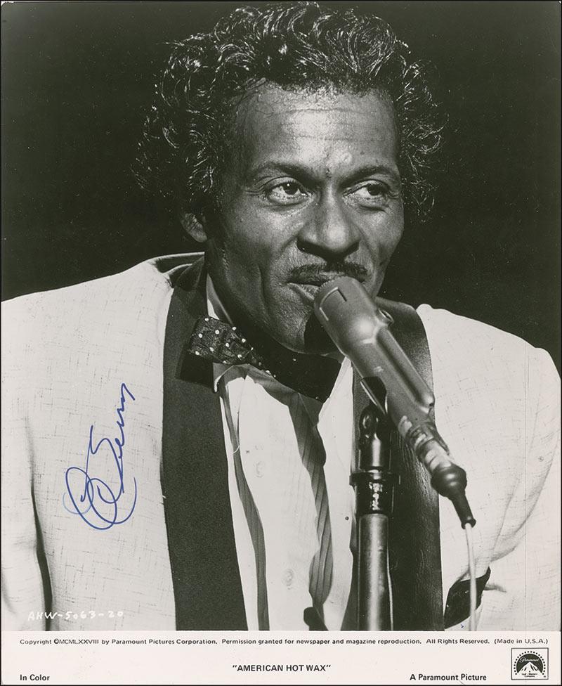Glossy 8 x 9.75 Paramount promotional photo for American Hot Wax, signed in blue felt tip. Scattered light surface marks and dings, and light edge wear from previous framing, otherwise fine condition.