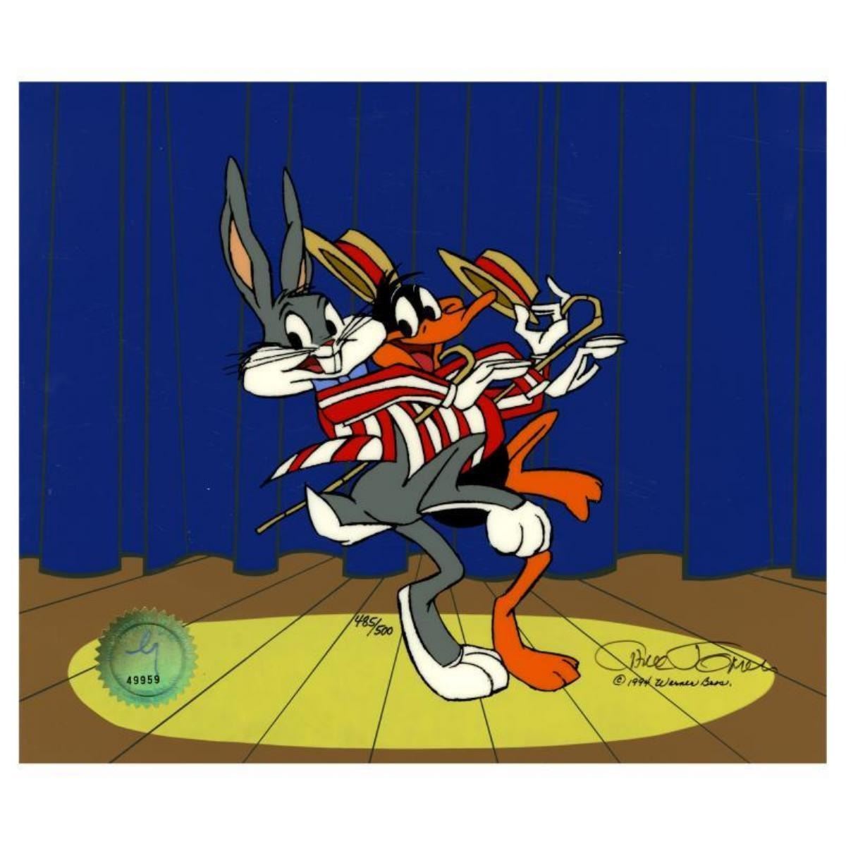 "Bugs And Daffy: Curtain Call" is a limited edition animation cel with hand painted coloring on sericel outline. The piece is numbered, hand signed by Chuck Jones (1912-2002), and includes a Certificate of Authenticity! Measures Approx: 12.5" x 10.5"