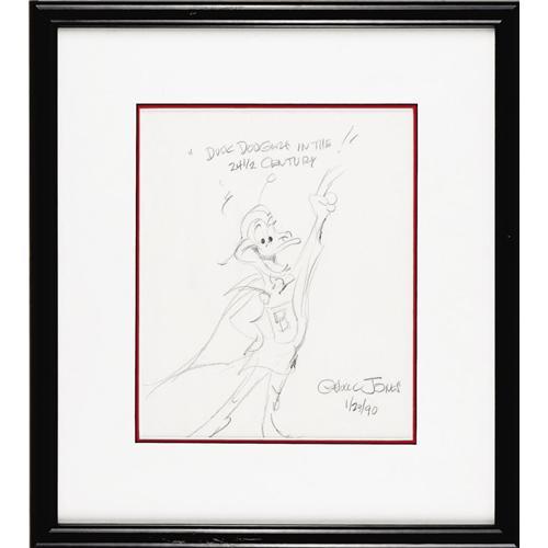 <B>Chuck Jones - "Duck Dodgers in the 241/2 Century" Sketch Original Art (Warner Bros., 1990).</B></I> "Duck Dodgers to the rethscue!" The hero with nerves of steel, and the fastest ship this side of the crab nebula, is drawn by his creator, Chuck Jones. Rendered in graphite, the image area measures 9" x 11", and the condition is Very Good. Matted and framed, and signed by Chuck Jones at the bottom right. <BR><BR><B>Important notice:</B> Heritage usually auctions material at the rate of 200-250 lots per hour. On some occasions eBay Live bid software or the Internet may not be able to keep up with the pace of the auction. We recommend placing a realistic absentee bid now as insurance to avoid disappointment. Occasionally the auctioneer may eliminate or reject an eBay Live bid, and the auctioneer may also reopen a lot after the close of the eBay live bidding (usually because we missed an audience bid), and may reject your bid even if it shows you as the winning bidder. By bidding via eBay Live, you agree that Heritage may award the lot to another bidder at its sole discretion under the circumstances described above or any other reasonable circumstances. Since eBay bids are not shown to us until we open the lot on the floor, we treat those bids just like floor bids. In most cases the floor responds before the eBay bid is presented to us, due to Internet lag time, so for consistency we have made it a policy that floor bids are always considered first over tie eBay live bids. Also please note that all Heritage lots purchased through eBay Live carry a 22.5% Buyer's Premium. Please make sure you read the Terms and Conditions before you bid. This lot is being auctioned in conjunction with a live floor auction by Heritage Auction Galleries. All final auction and invoice information will be supplied by Heritage Auction Galleries, and all other information should be considered preliminary. Lot:41001 <BR><BR><B>Winning Notification and Billing:</B> After the FINAL session in this auction is complete, Heritage will send e-mail and snail mail invoices. This process normally takes several days. All final auction and invoice information will be supplied by Heritage Auction Galleries, and all other information should be considered preliminary. <BR><BR>This auction will be conducted on a live auction floor and over the Internet through eBay Live. If you choose to place an absentee bid, please take a moment to <font color='#0000ff'><u><a href='http://pages.ebay.com/liveauctions/help/before/laabsentee.html'>learn how eBay Live absentee bidding works</a></u></font><font color='#000000'>