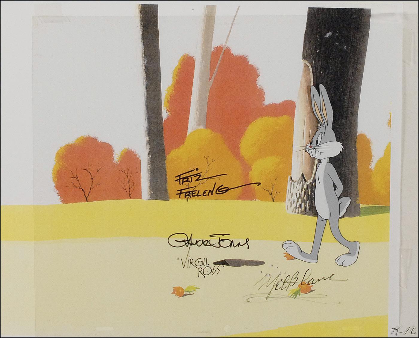 Original hand-painted animation cel of Bugs Bunny, #R-10, 12.5 x 10.5, circa 1956–1964, showing Bugs walking with his hands behind his back, signed in black felt tip by Chuck Jones, Friz Freleng, Mel Blanc, and Virgil Ross. Cel is set against a pre-printed color background. In fine condition. A seldom-seen and desirable combination of animation greats.