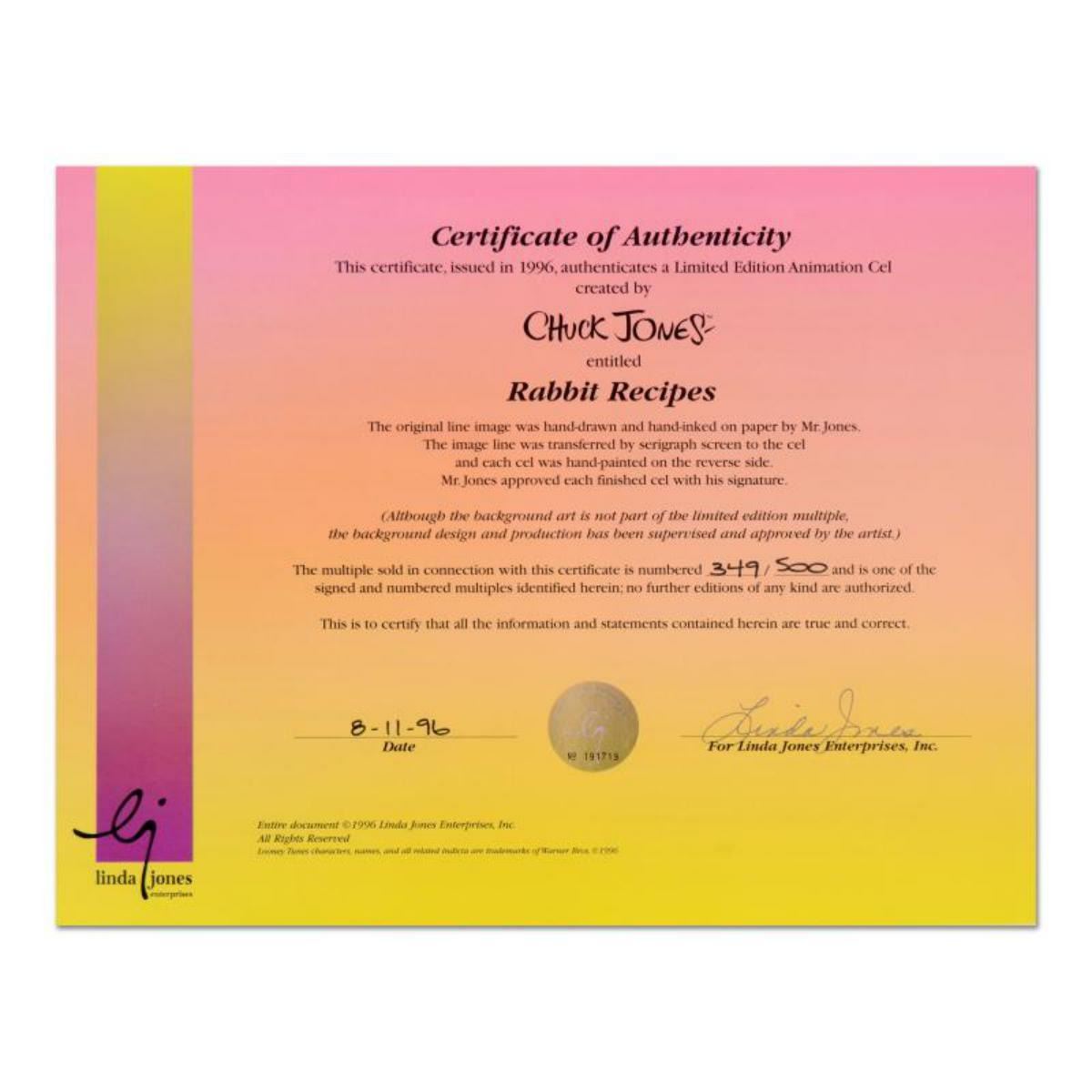 "Rabbit Recipes" is a limited edition animation cel with hand painted coloring on sericel outline. The piece is numbered, hand signed by Chuck Jones (1912-2002), and includes a Certificate of Authenticity! Measures Approx: 12.5" x 10.5" Reference #: 222925.