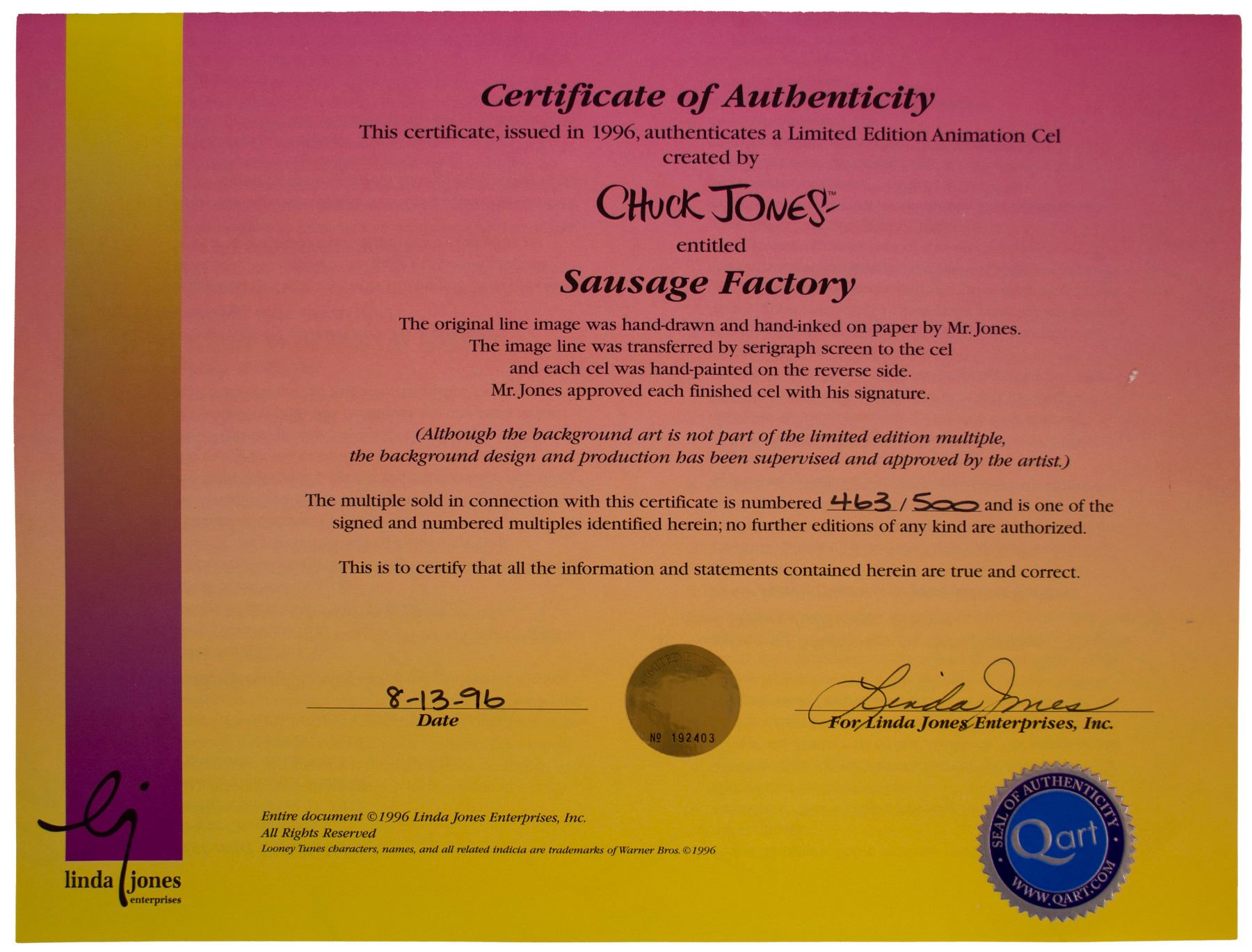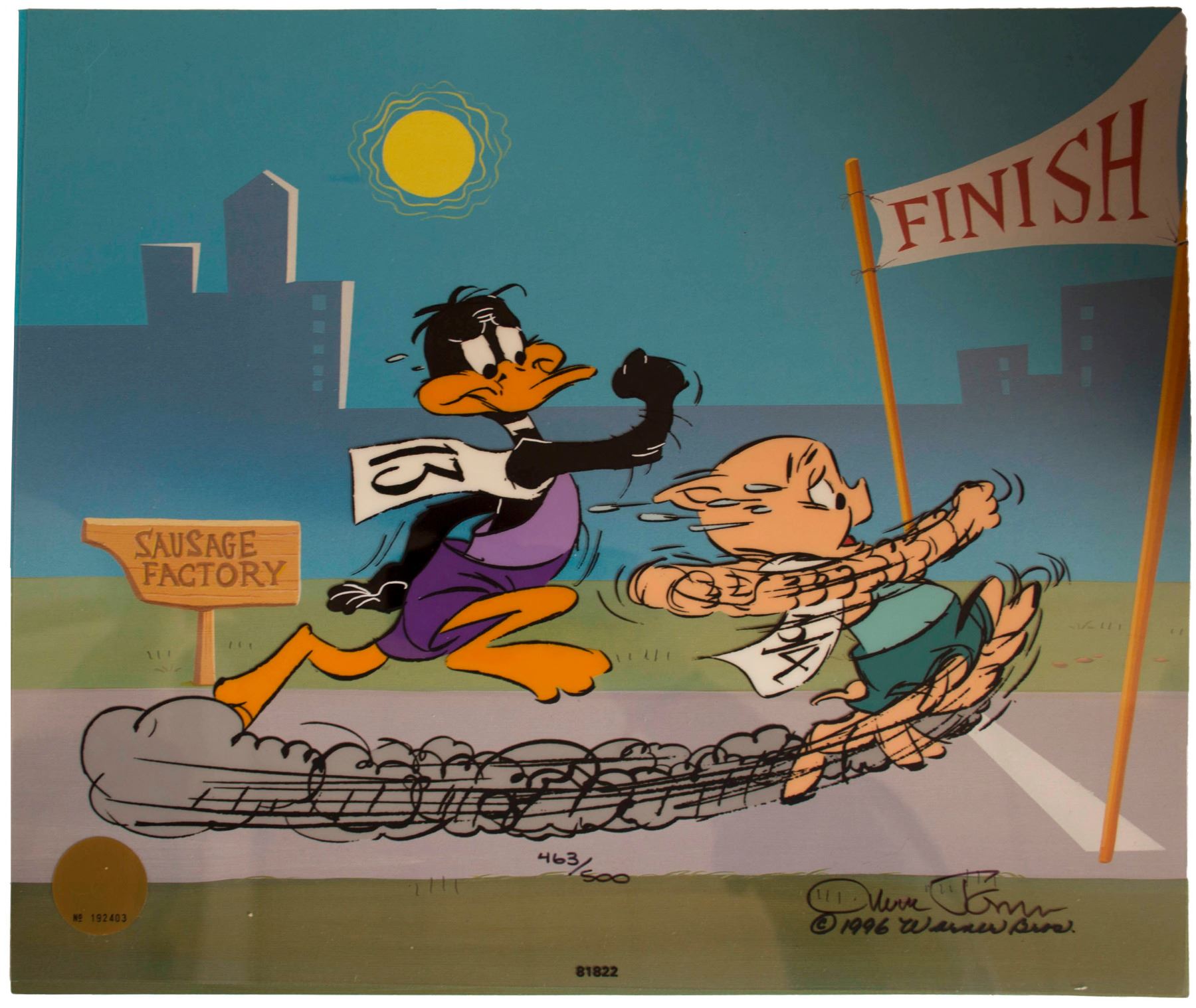 Warner Brothers Looney Tunes hand-painted sericel signed by Chuck Jones, part of a limited edition of 500, this being #463. Entitled ''Sausage Party'', Jones here shows Daffy Duck and Porky Pig racing each other across a finish line. Cel is from 1996, and measures 12.5'' x 10.5'', with a loose background of equal size. Near fine condition. With the seal and COA from Linda Jones Enterprises Inc., the business run by Jones' daughter and through which he sold his artwork.