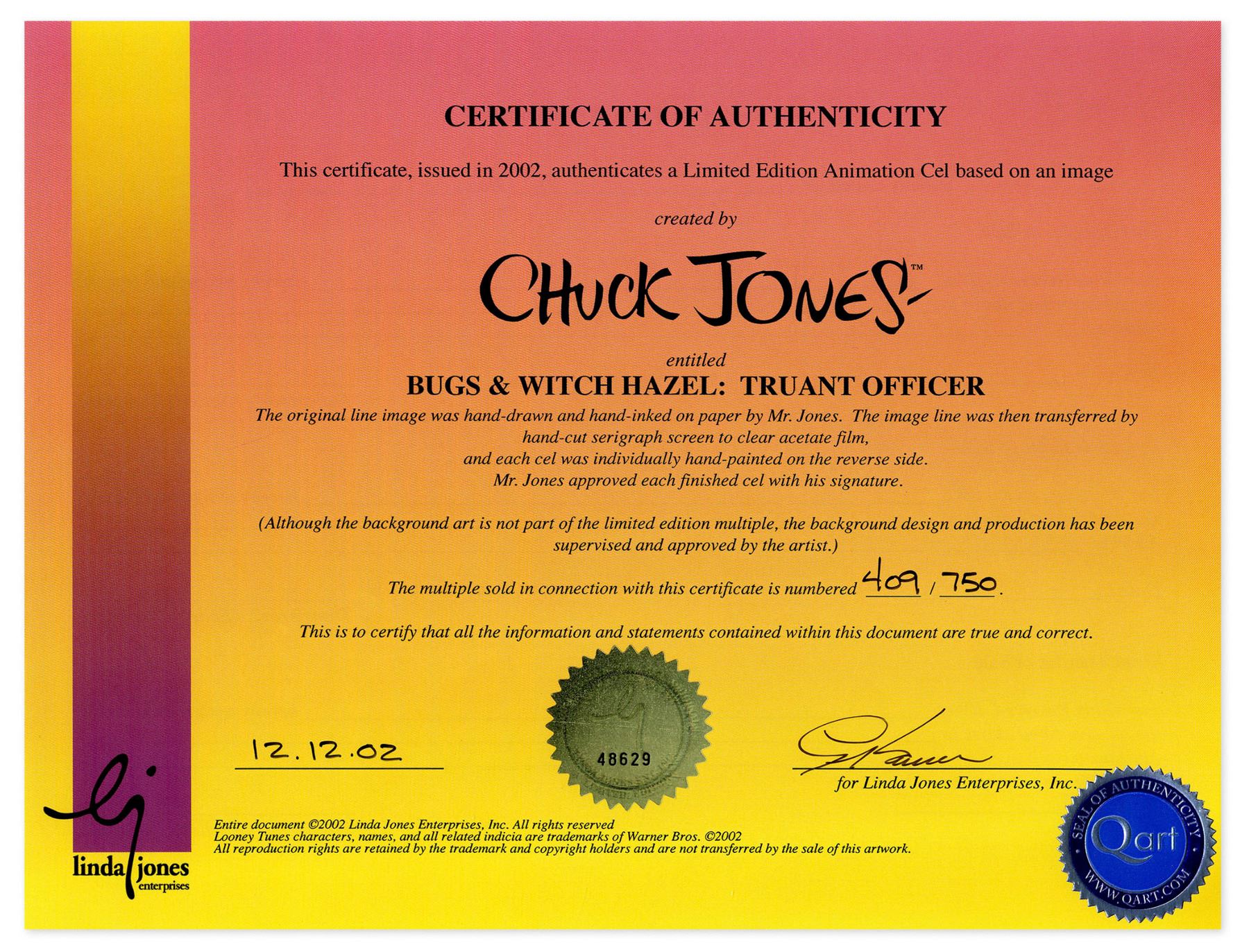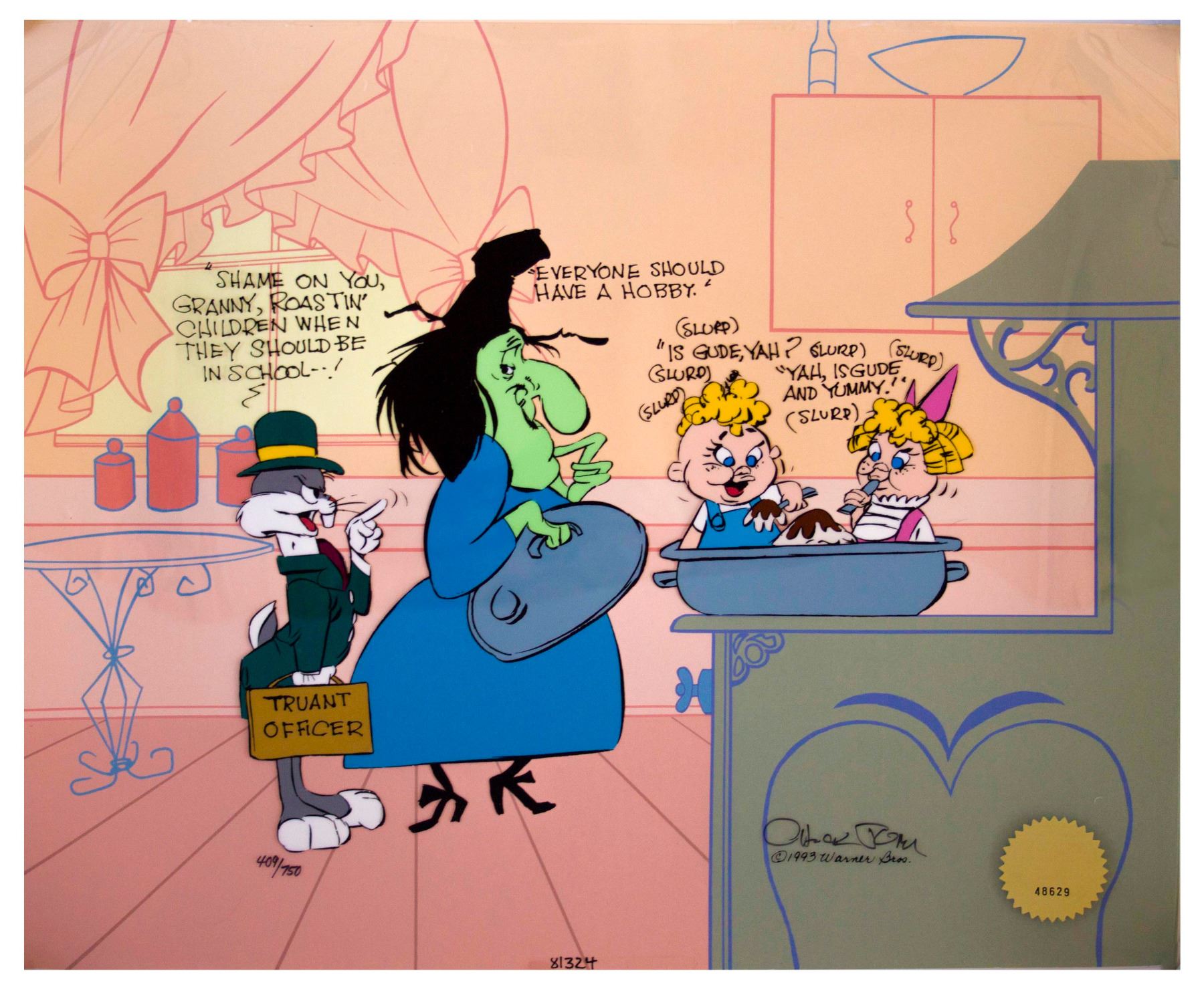 Warner Brothers Looney Tunes hand-painted sericel signed by Chuck Jones, part of a limited edition of 750, this being #409. Entitled ''Bugs and Witch Hazel'', Jones here shows Bugs Bunny as a truant officer who aims to save two children from Witch Hazel's clutches. Cel is from 2002, and measures 16.5'' x 13.5'', with a background of equal size, affixed to the cel at top. Near fine condition. With the seal and matching COA from Linda Jones Enterprises Inc., the business run by Jones' daughter and through which he sold his artwork.