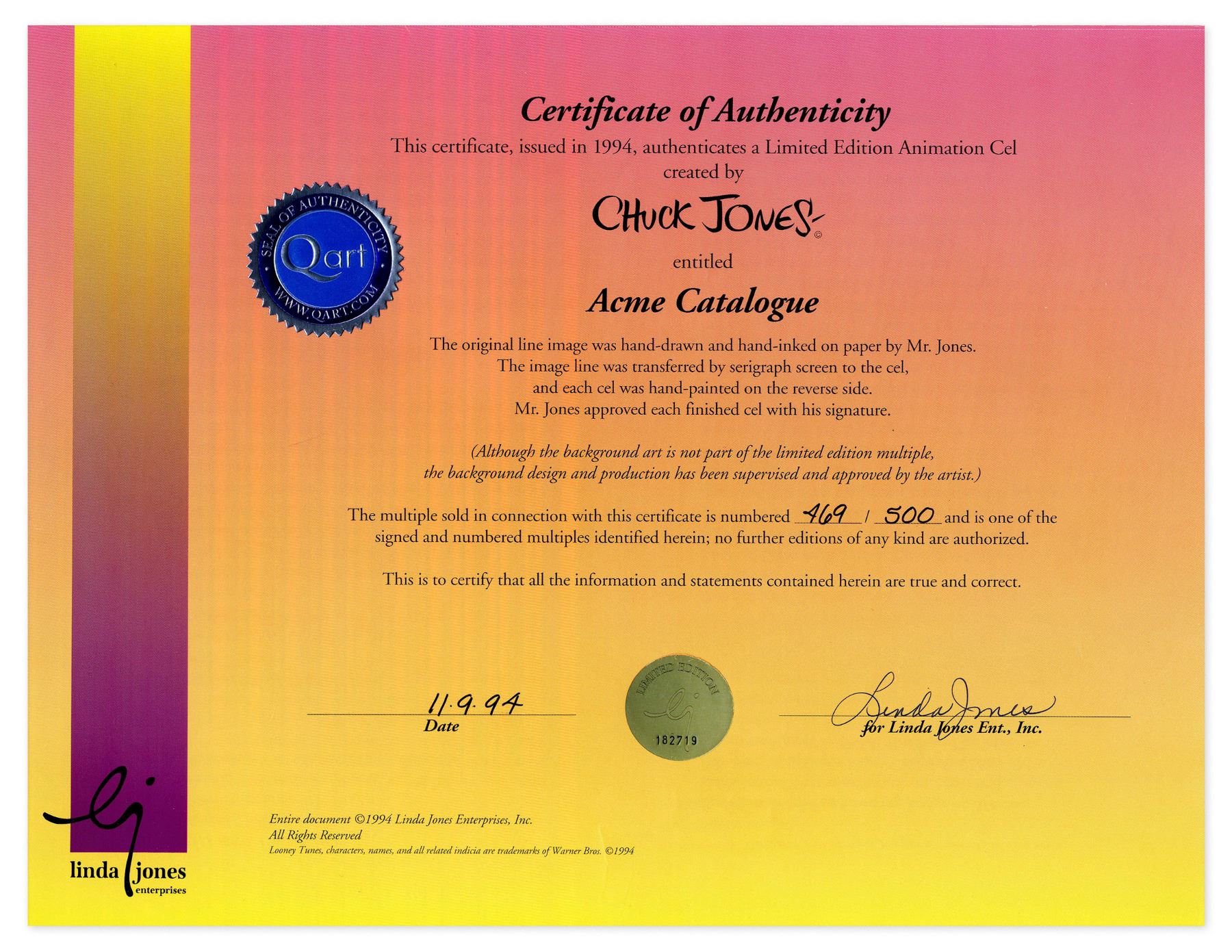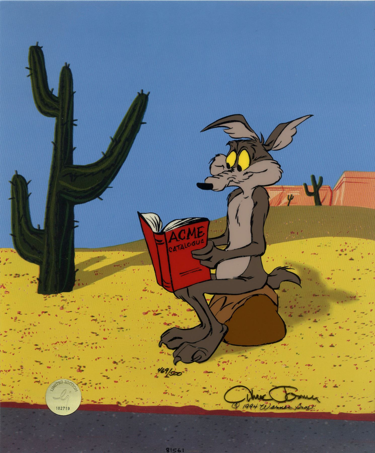 Warner Brothers Looney Tunes hand-painted cel signed by Chuck Jones, part of a limited edition of 500, this being #469. Entitled ''Acme Catalogue'', Jones shows Wile E. Coyote reading the latest offerings from Acme Catalogue, likely looking for explosives to harass Roadrunner and Bugs Bunny. Cel is from 1994, and measures 10.5'' x 12.5'', with a loose background of equal size. Near fine condition. With the seal and COA from Linda Jones Enterprises Inc., the business run by Jones' daughter and through which he sold his artwork.