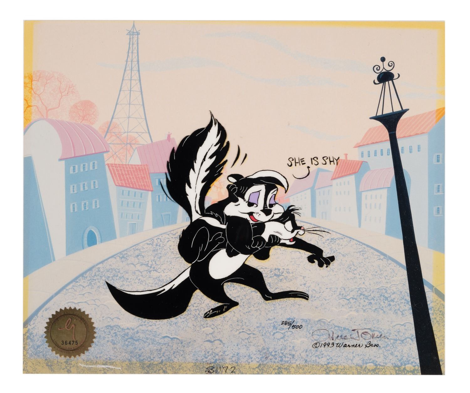 (Warner Bros., 1993) A hand-painted Limited Edition Cel titled "She is Shy" signed by animator Chuck Jones. This Warner Bros. Studio limited edition cel celebrates Pepe Le Pew and Penelope Pussycat. The cel is numbered "285/500." Measuring 10.75"x12.5", the cel is in fine condition.