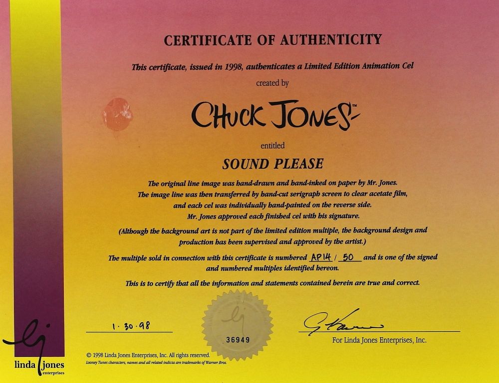 The piece includes an official hologram and matching COA from Linda Jones Enterprises representing Chuck Jones.