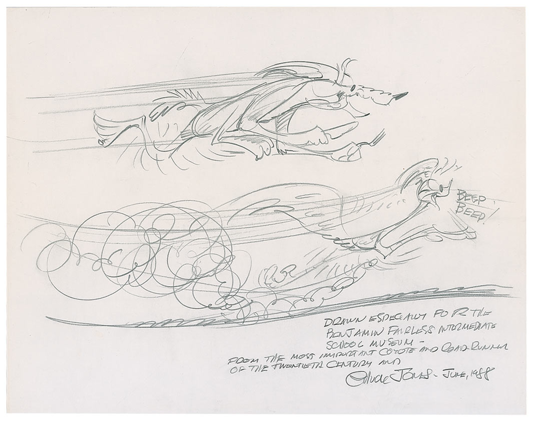 Original signed and inscribed pencil sketch of the Road Runner being chased by Wile E. Coyote wielding a knife and fork on an off-white 14 x 11 heavy card, signed and inscribed “Drawn especially for the Benjamin Fairless Intermediate School Museum—from the most important Coyote and Road–Runner of the Twentieth Century and Chuck Jones - June 1988.” In fine condition. A fantastic oversized one-of-a-kind drawing featuring two seldom-seen, but nonetheless, highly desirable characters.