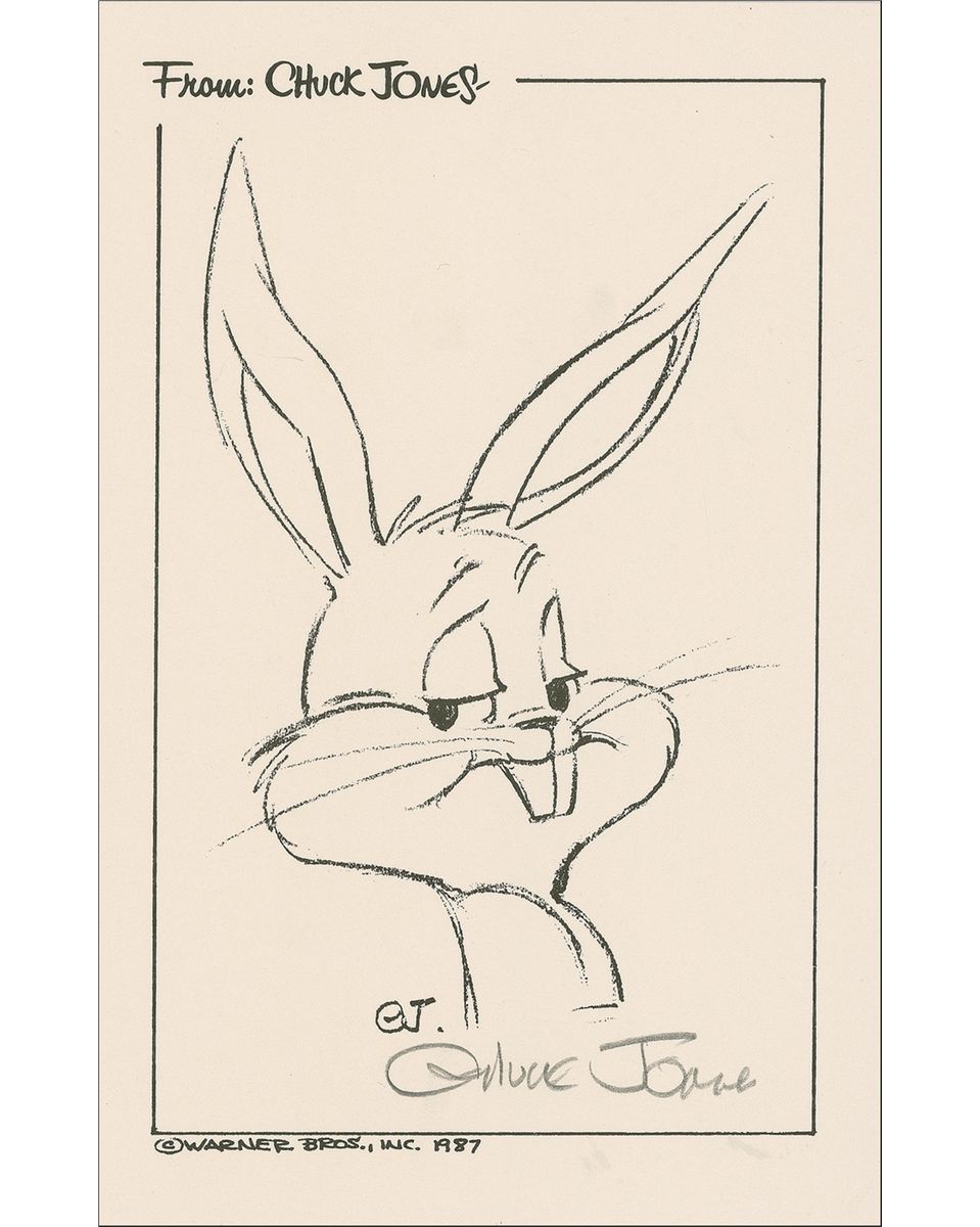 Printed sketch of Bugs Bunny on an off-white 5.5 x 8.5 sheet, signed below in pencil, “Chuck Jones.” In fine condition.