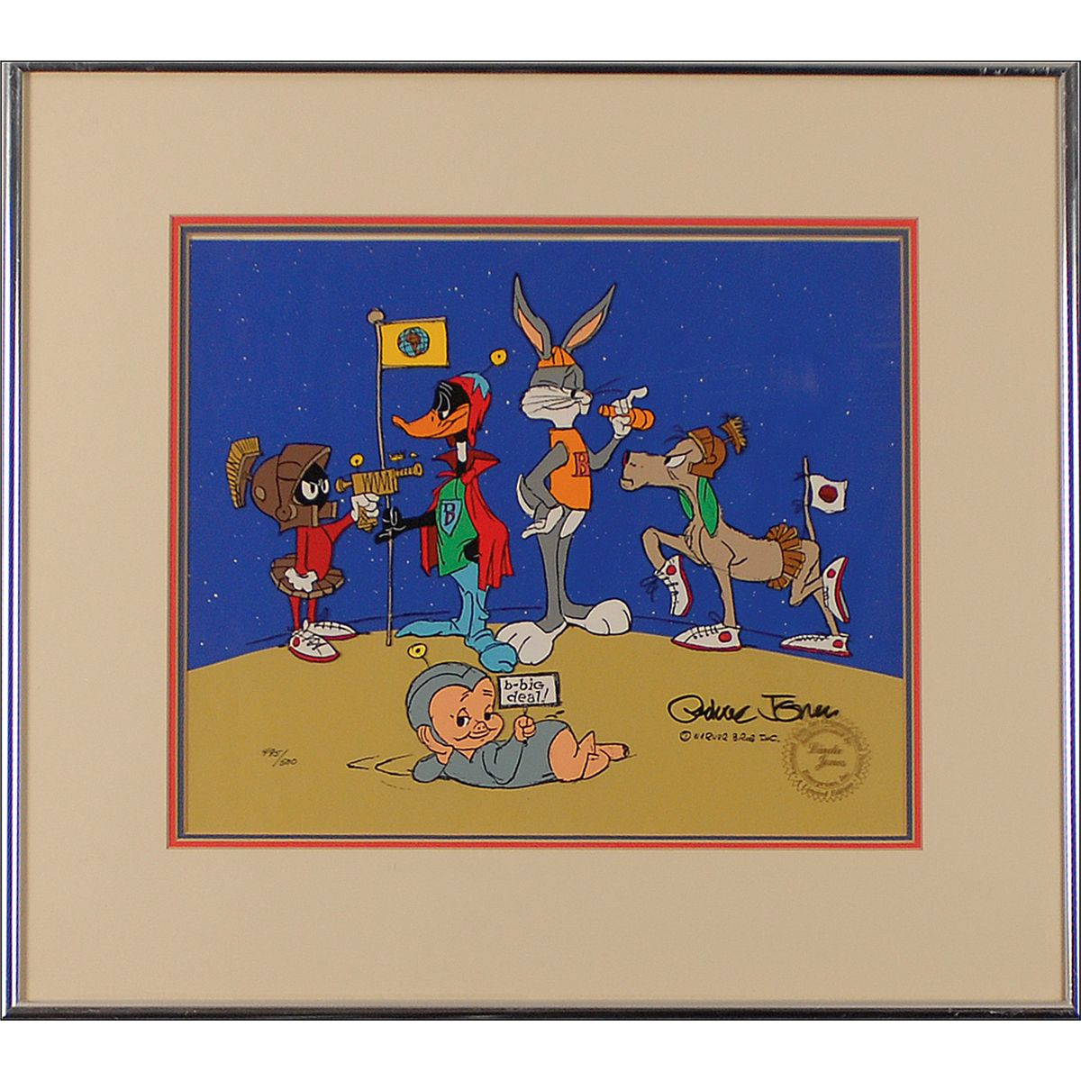 Limited edition hand-painted animation cel featuring Marvin the Martian, Bugs Bunny, and a slew of other Looney Tunes characters, numbered #495/500, 12 x 10, signed in black felt tip by Jones and presented against a pre-printed color background. Triple matted and framed to an overall size of 18.25 x 16.25. In fine condition.