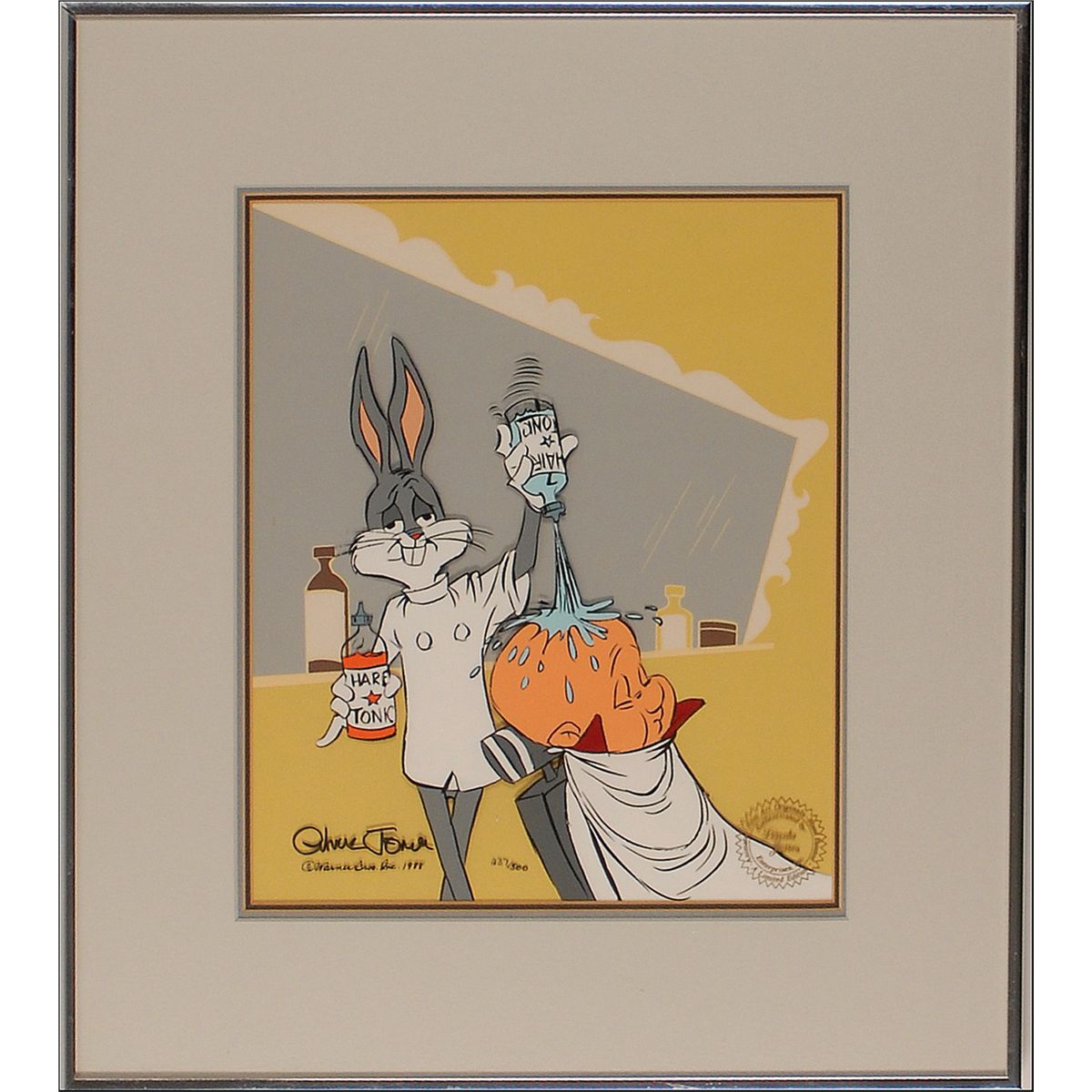 Limited edition hand-painted animation cel entitled ‘Rabbit of Seville II,’ featuring Bugs Bunny as Elmer Fudd’s barber, numbered #237/500, 9.75 x 11.75, signed in black felt tip by Jones and presented against a pre-printed color background. Triple matted and framed to an overall size of 16.25 x 18.25. In fine condition.