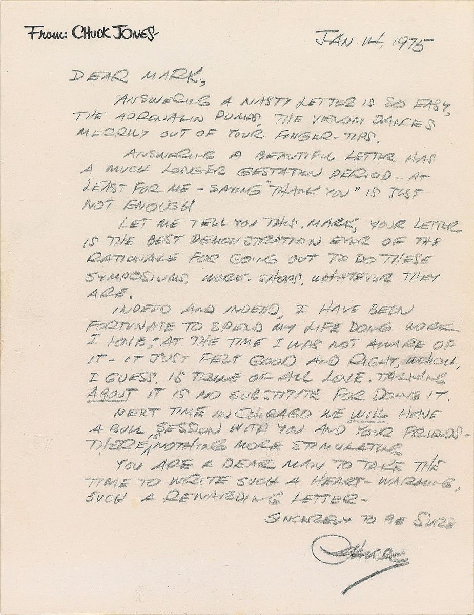 ALS in pencil, signed “Chuck,” one page, 8.5 x 11, personal letterhead, January 14, 1975. Letter to Mark, in part: “Answering a nasty letter is so easy, the adrenalin[e] pumps, the venom dances merrily out of your finger-tips. Answering a beautiful letter has a much longer gestation period—at least for me—saying ‘thank you’ is just not enough. Let me tell you this, Mark, your letter is the best demonstration ever of the rationale for going out to do these symposiums. Work. Shops. Whatever they are. Indeed and indeed, I have been fortunate to spend my life doing work I love; at the time I was not aware of it—it just felt good and right.” In overall fine condition.