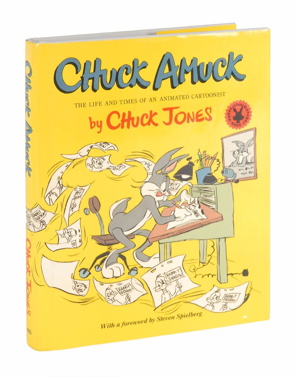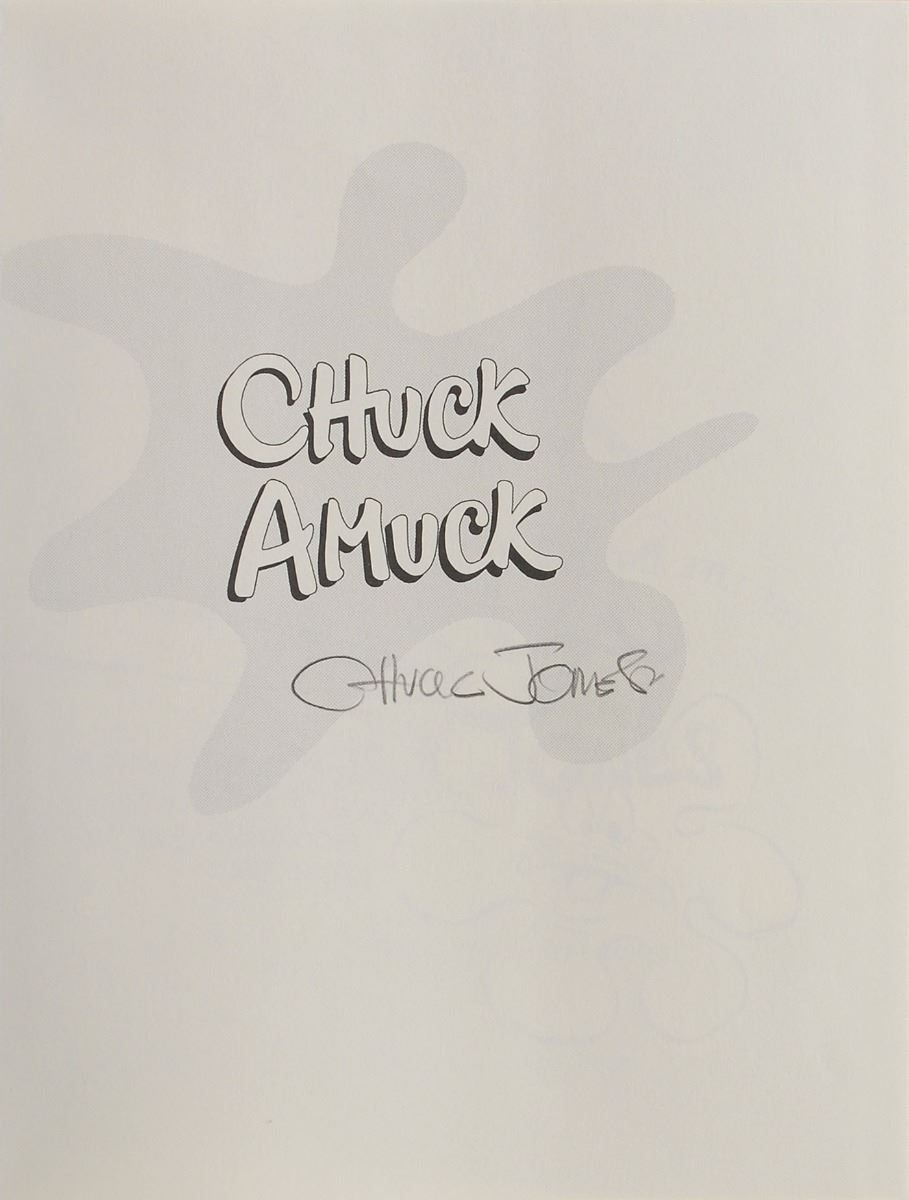 Signed book: Chuck Amuck. Later printing. NY: Farrar, Straus and Giroux, 1990. Hardcover with dust jacket, 8.25 x 10.25, 302 pages. Signed on the title page in pencil, “Chuck Jones.” In fine condition. Accompanied by an invitation to the event where this was signed.