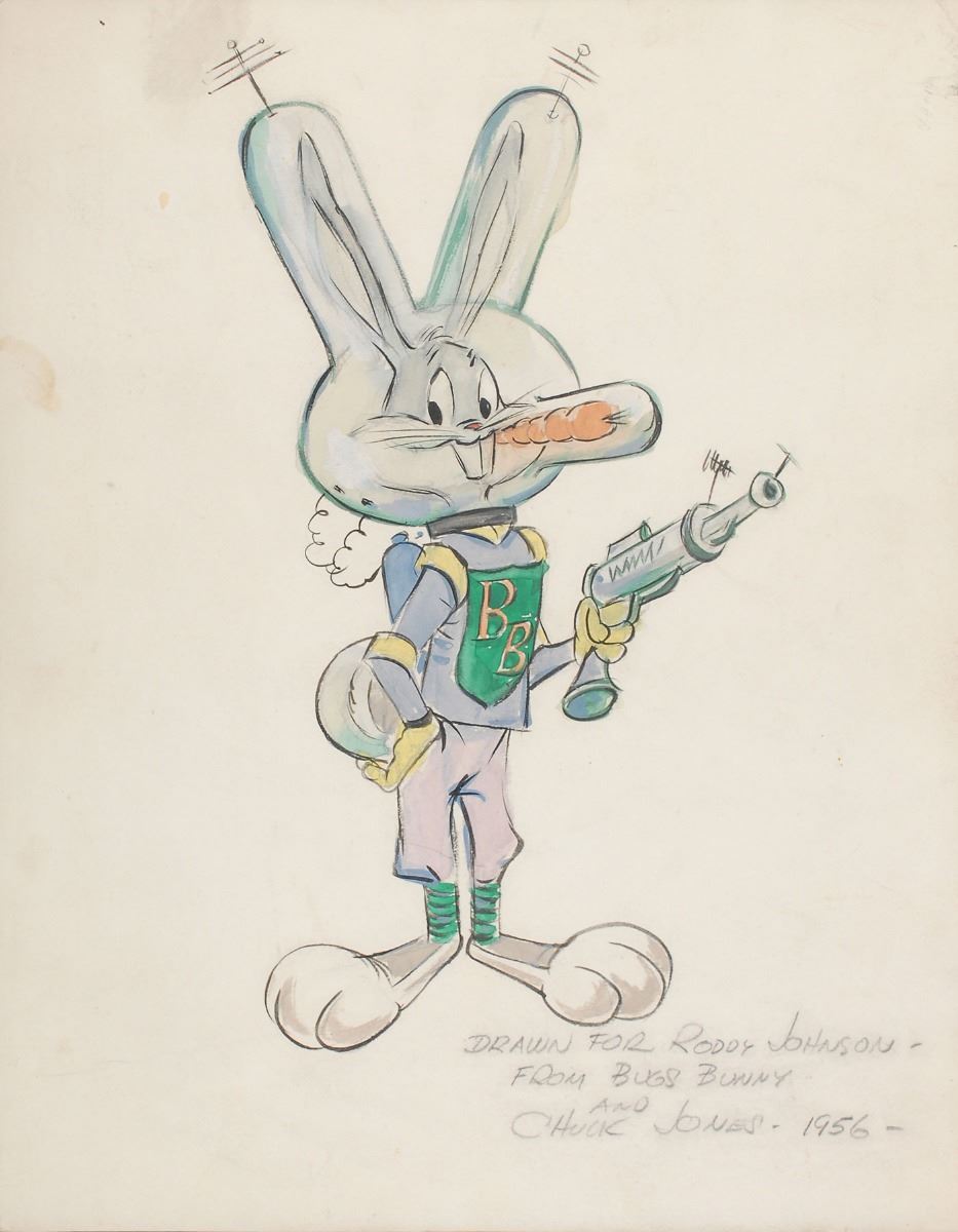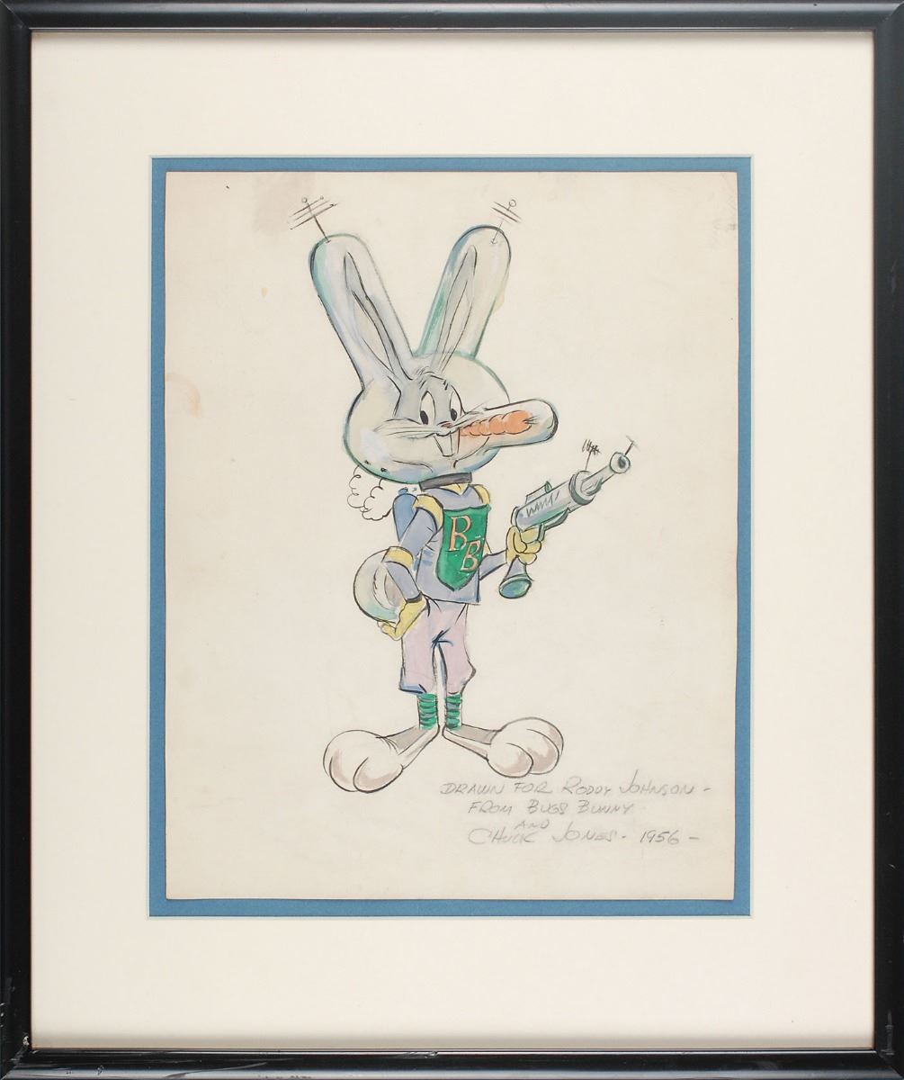 Fantastic original ink and gouache sketch of Bugs Bunny in a specialized spacesuit holding a ray gun, accomplished by Jones on an off-white 9 x 11.5 sheet, signed and inscribed in pencil, “Drawn for Roddy Johnson—From Bugs Bunny and Chuck Jones—1956.” Mounted, matted, and framed to an overall size of 14.25 x 17. In very good to fine condition, with light smudging in the margins and to the penciled handwriting.