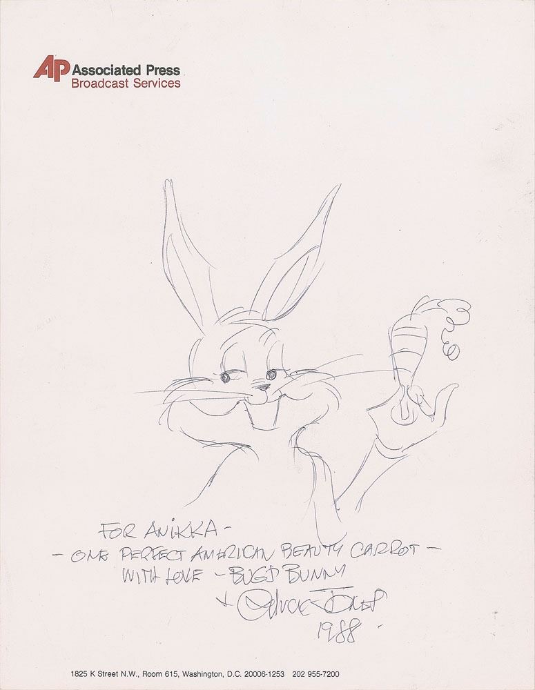 Wonderful original ballpoint sketch of Bugs Bunny holding a carrot on an off-white 8.5 x 11 sheet of Associated Press letterhead, signed and inscribed below, "For Anikka—One perfect American beauty carrot—with love—Bugs Bunny & Chuck Jones, 1988." In fine condition.
