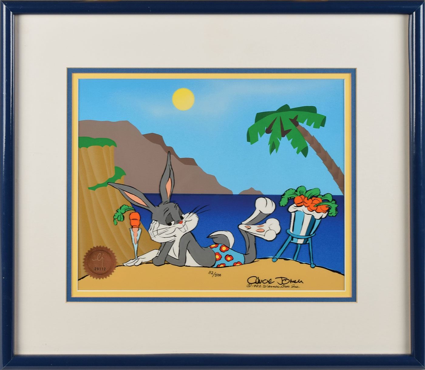 Limited edition hand-painted animation cel showing Bugs Bunny lounging with carrots on a tropical beach, numbered 112/500, 12 x 9.5, signed in the lower right in black felt tip by Chuck Jones. Cel bears a 1992 Warner Bros. copyright notice and an affixed Linda Jones Enterprises limited edition label. Triple-matted and framed against a preprinted background to an overall size of 19 x 16.5. In fine condition.