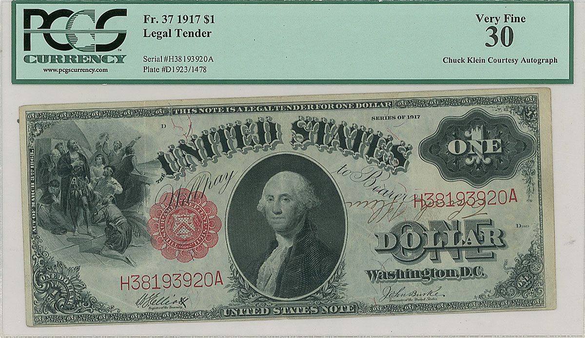 Baseball Hall of Famer (1904–1958) who was the last player to lead the league in home runs and stolen bases in the same season. Rare series 1917 one dollar bill, 7.5 x 3, signed upside down on the serial number in fountain pen. Note is housed in a PCGS authentication sleeve, grading it “Very Fine 30.” Three vertical folds (one passing through a single letter of the signature), a few light wrinkles and creases, and the signature a shade light and slightly affected by the serial number, otherwise fine condition. Accompanied by a full letter of authenticity from PSA/DNA.