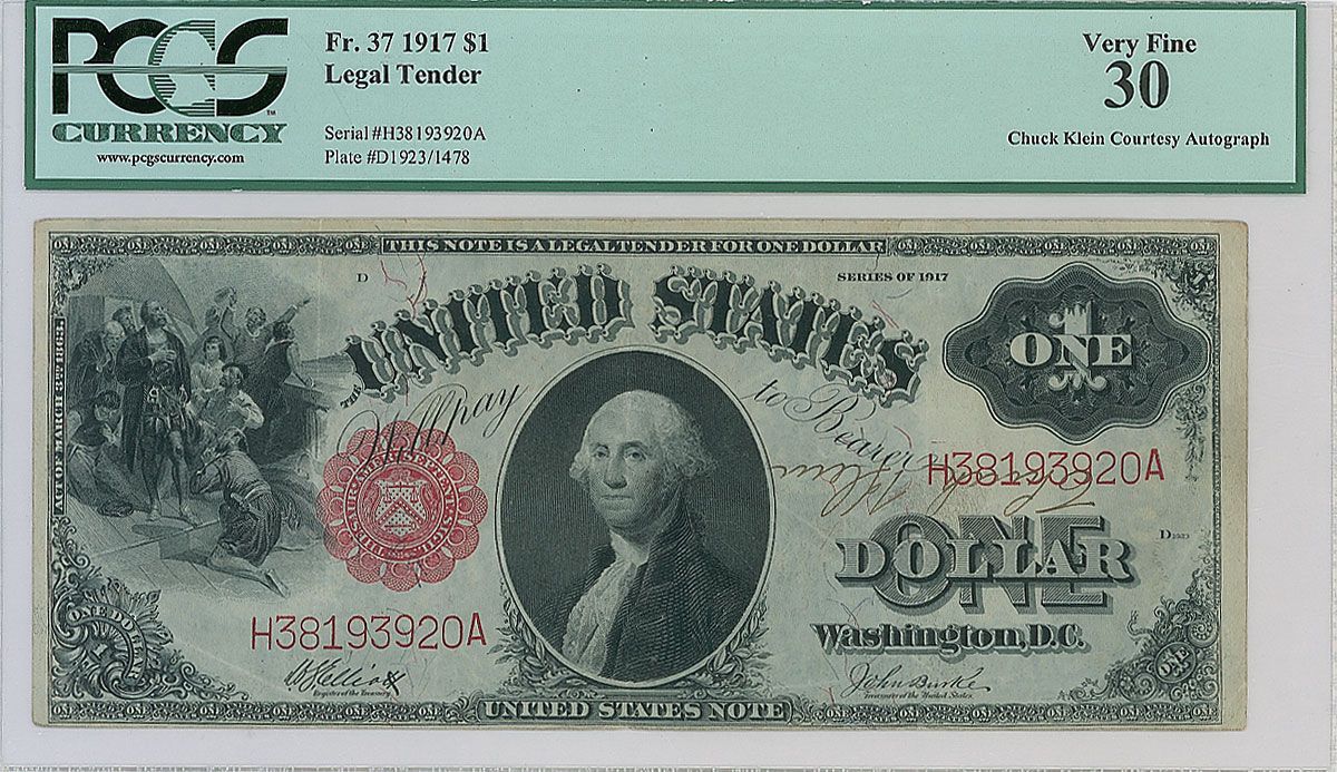 Baseball Hall of Famer (1904–1958) who was the last player to lead the league in home runs and stolen bases in the same season. Rare series 1917 one dollar bill, 7.5 x 3, signed upside down on the serial number in fountain pen. Note is housed in a PCGS authentication sleeve, grading it “Very Fine 30.” Three vertical folds (one passing through a single letter of the signature), a few light wrinkles and creases, and the signature a shade light and slightly affected by the serial number, otherwise fine condition. Accompanied by a full letter of authenticity from PSA/DNA.