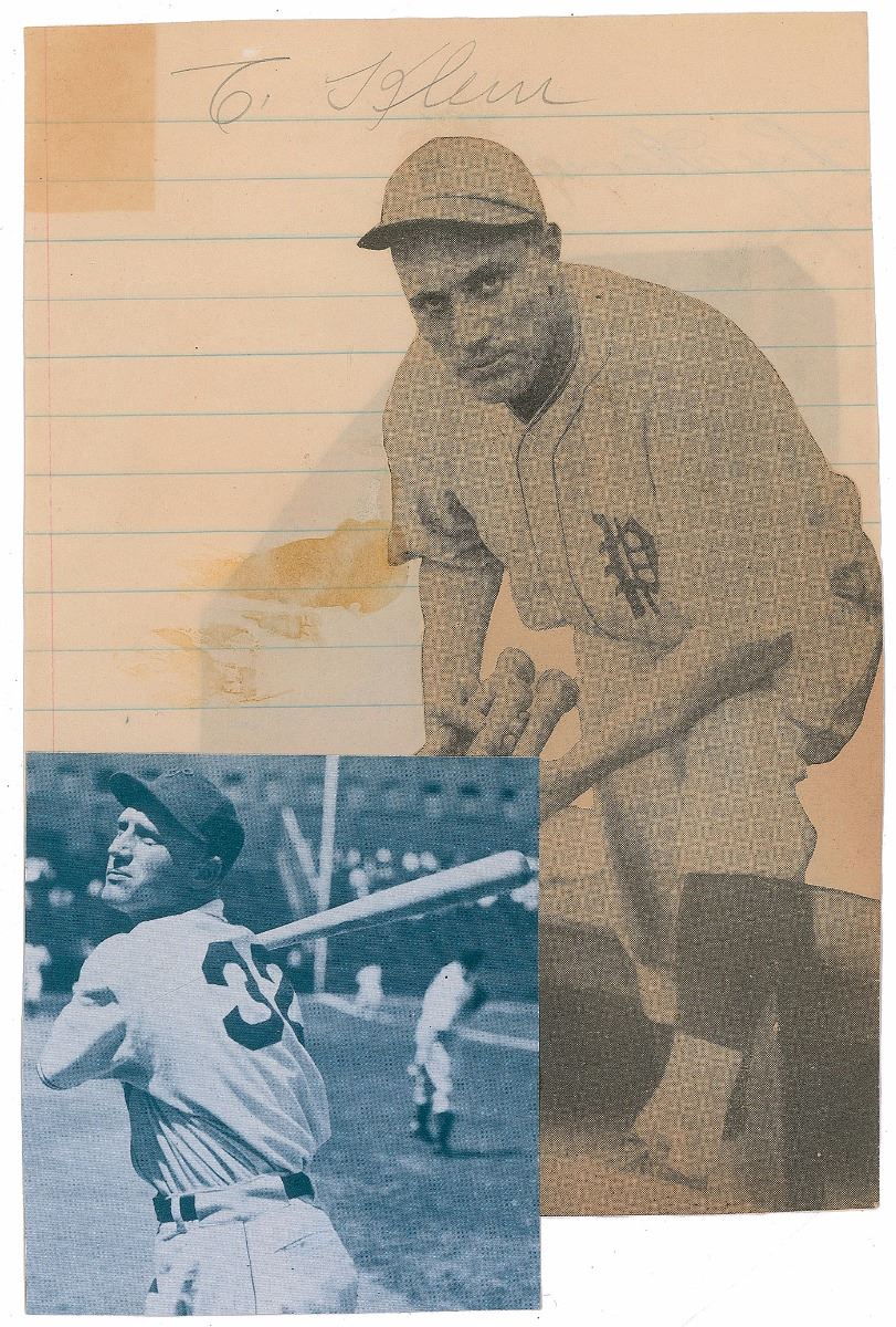 Baseball Hall of Famer (1904–1958) who was the last player to lead the league in home runs and stolen bases in the same season. Vintage pencil signature, “C. Klein,” on an off-white 5.5 x 8 lined sheet bearing two affixed photos. Uniform toning, a small hole just above his first initial, and scattered toning and adhesive remnants to the sheet, otherwise fine condition.