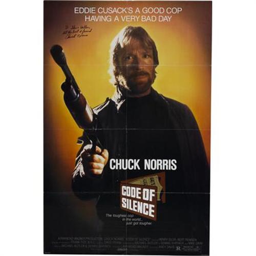 <B>Chuck Norris Signed Poster.</B></I> A movie poster for <I>Code of Silence</B></I> signed by the actor in black marker, in Excellent condition with fold creases and light wear.<BR><BR><b>Shipping:</b> Flat Material, Small (<a target="_blank" href="http://www.heritageauctions.com/common/shipping.php">view shipping information</a>\)