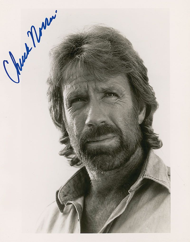 Glossy 8 x 10 head-and-shoulders photo of Norris from one of his early films, signed in blue felt tip. In fine condition.