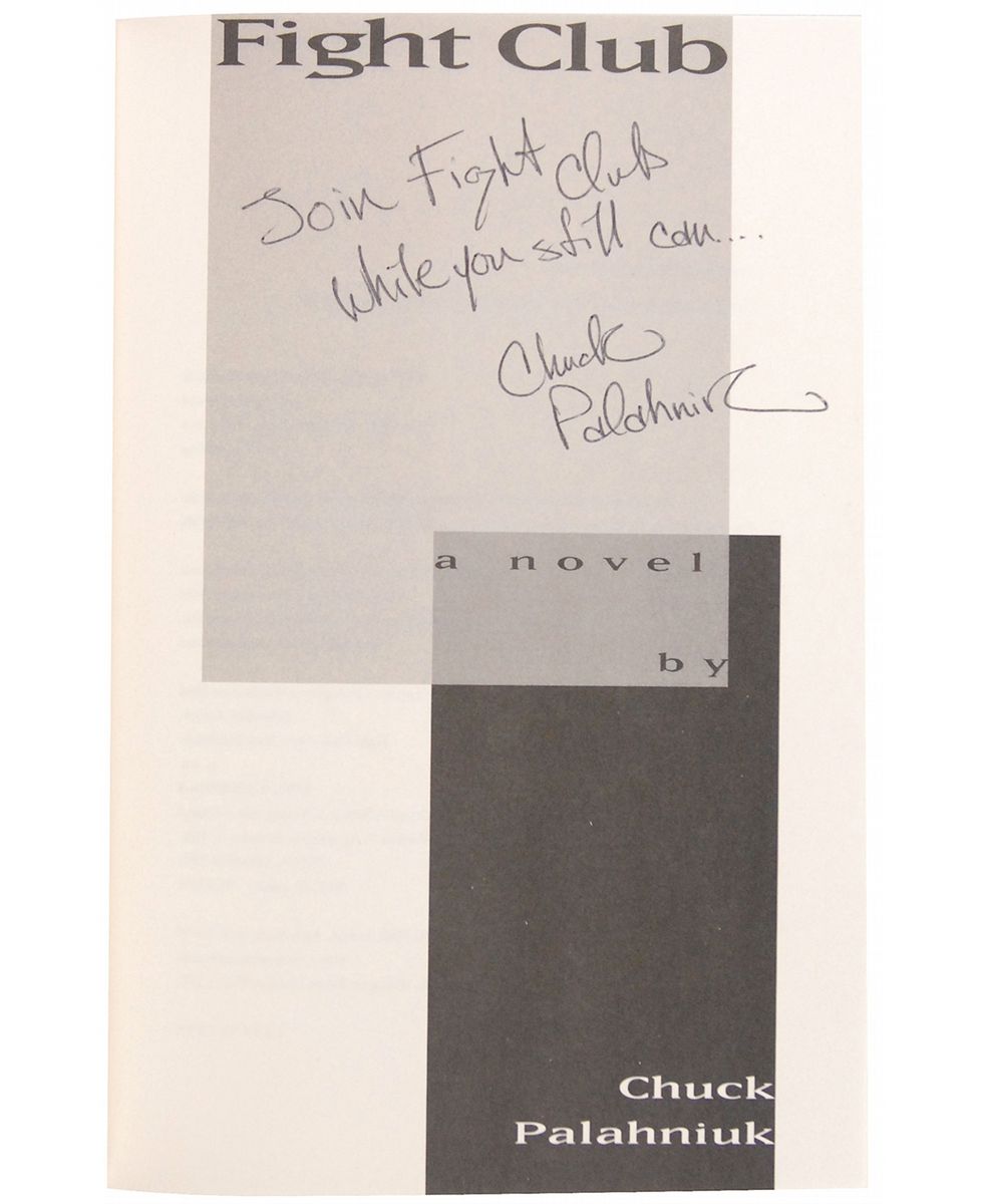 Signed book: Fight Club. First edition, first printing. NY: W. W. Norton and Company, 1996. Hardcover with dust jacket, 6 x 8.5, 208 pages. Signed on the title page in black ballpoint, “Join Fight Club while you still can… Chuck Palahniuk.” In fine condition.