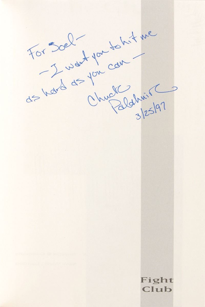 Signed book: Fight Club. First edition. NY: W. W. Norton & Company, 1996. Hardcover with dust jacket, 6 x 8.5, 208 pages. Signed and inscribed on the half-title page in blue ink, “For Joel—I want you to hit me as hard as you can—Chuck Palahniuk, 3/25/97.” In fine condition.