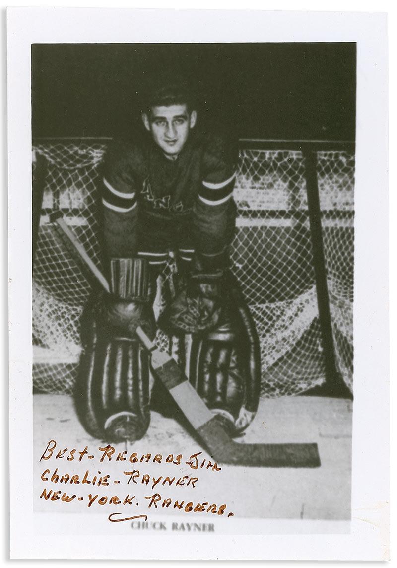 Hockey Hall of Famer (1920-2002). Glossy 3.5 x 5 photo of a hockey card of Rayner in the net for the Rangers, signed and inscribed in brown felt tip “Best regards, Jim, Charlie Rayner, New York Rangers.” In fine condition, with surface impressions from notations on reverse.