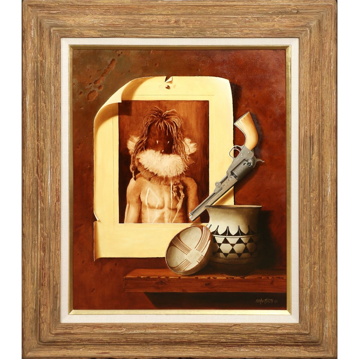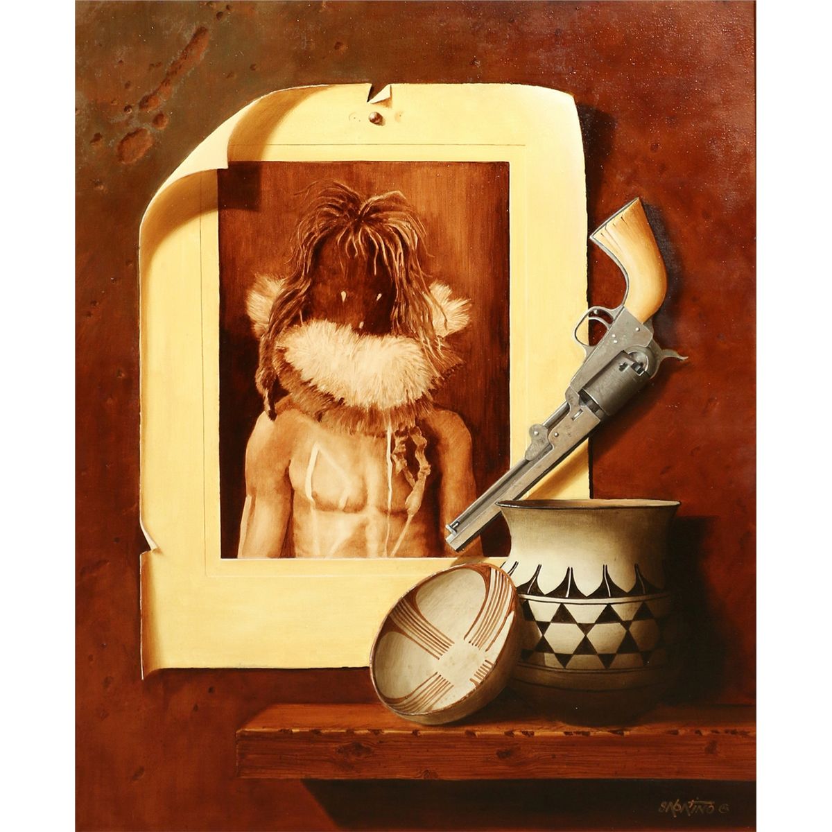 Chuck J. Sabatino (1935 - ). The Old Colt. 30" x 24" oil on canvas. Signed lower right: SABATINO ©. Verso: #285 E.S. CURTIS PHOTO "NAYENEZGANI - NAVAJO", MIMBRES BOWL, COCHITI POT, 1849 COLT .31 CALIBER BABY DRAGOON.