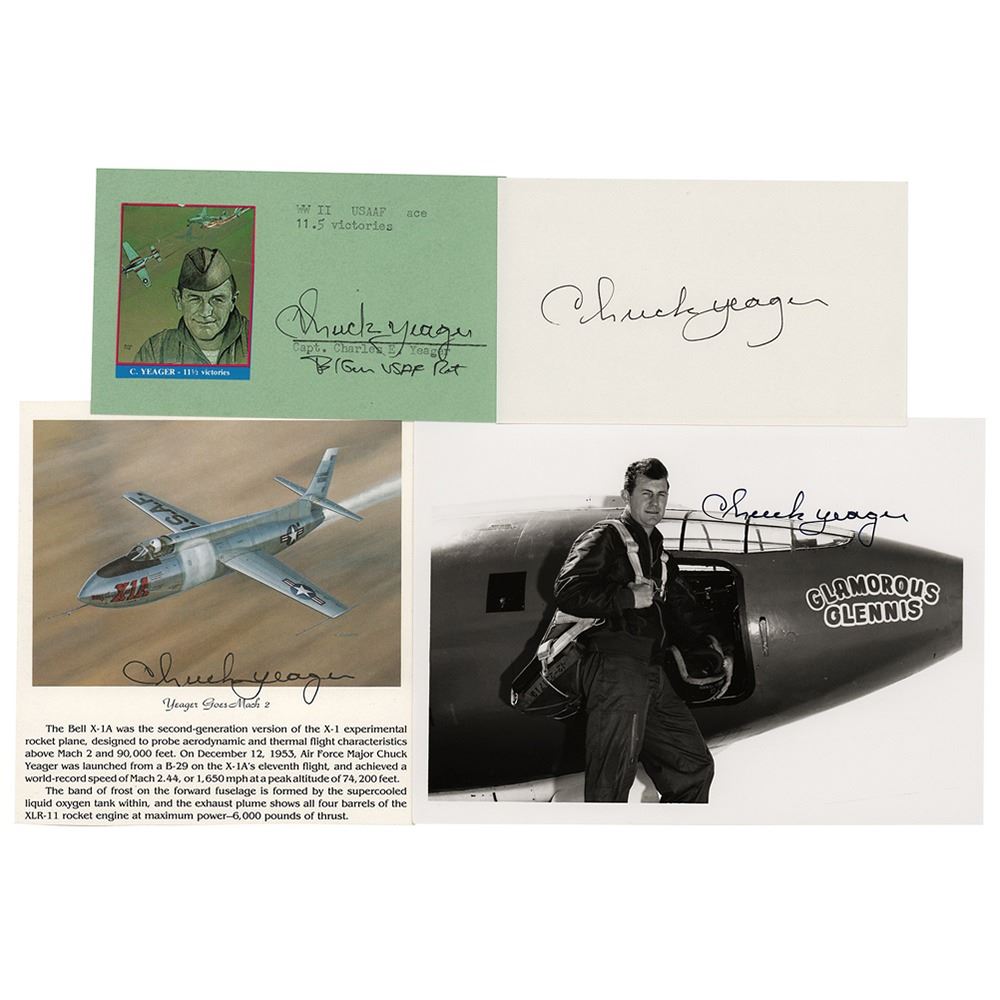 Four items signed in black ink or felt tip by Chuck Yeager: an off-white 5 x 3 card; a light green 5 x 3 card with affixed image; a color 5 x 5.25 trimmed print of the Bell X-1A; a glossy 7 x 5 photo of Yeager with the Glamorous Glennis. In overall fine condition.