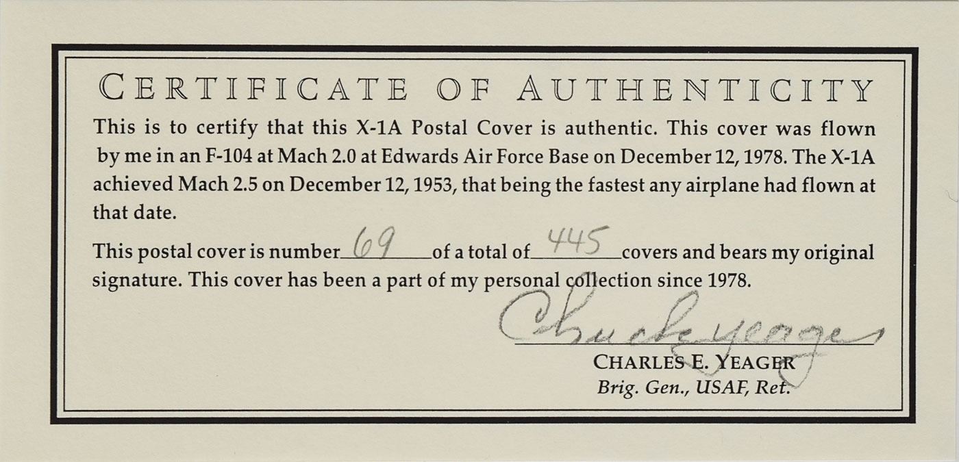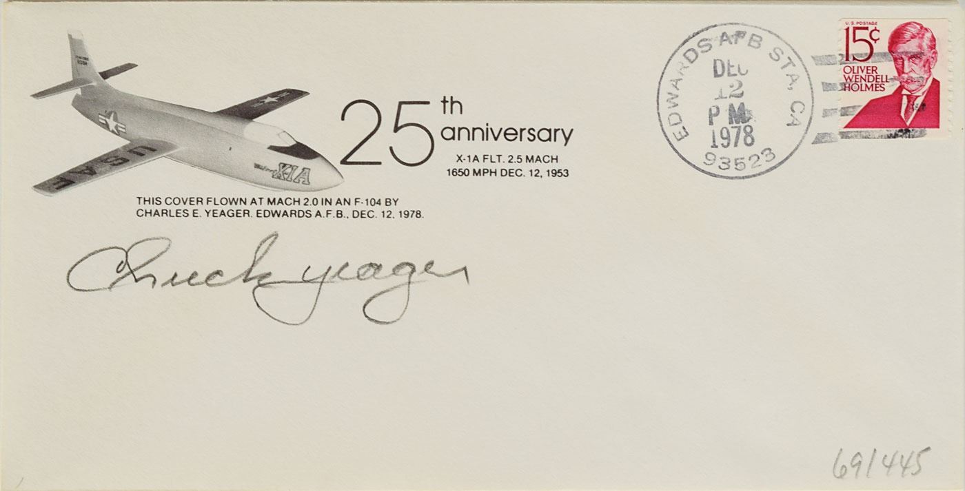 Limited edition flown postal cover, 7.5 x 4, with a cachet honoring the 25th anniversary of Chuck Yeager's Mach 2.44 X–1A flight on December 12, 1953, postmarked December 12, 1978, Edwards Air Force Base, numbered 69/445, signed in pencil by Yeager. Includes a certificate of authenticity signed by Yeager, who affirms that the cover "was flown by me in an F–104 at Mach 2.0 at Edwards Air Force Base on December 12, 1978." In fine condition.