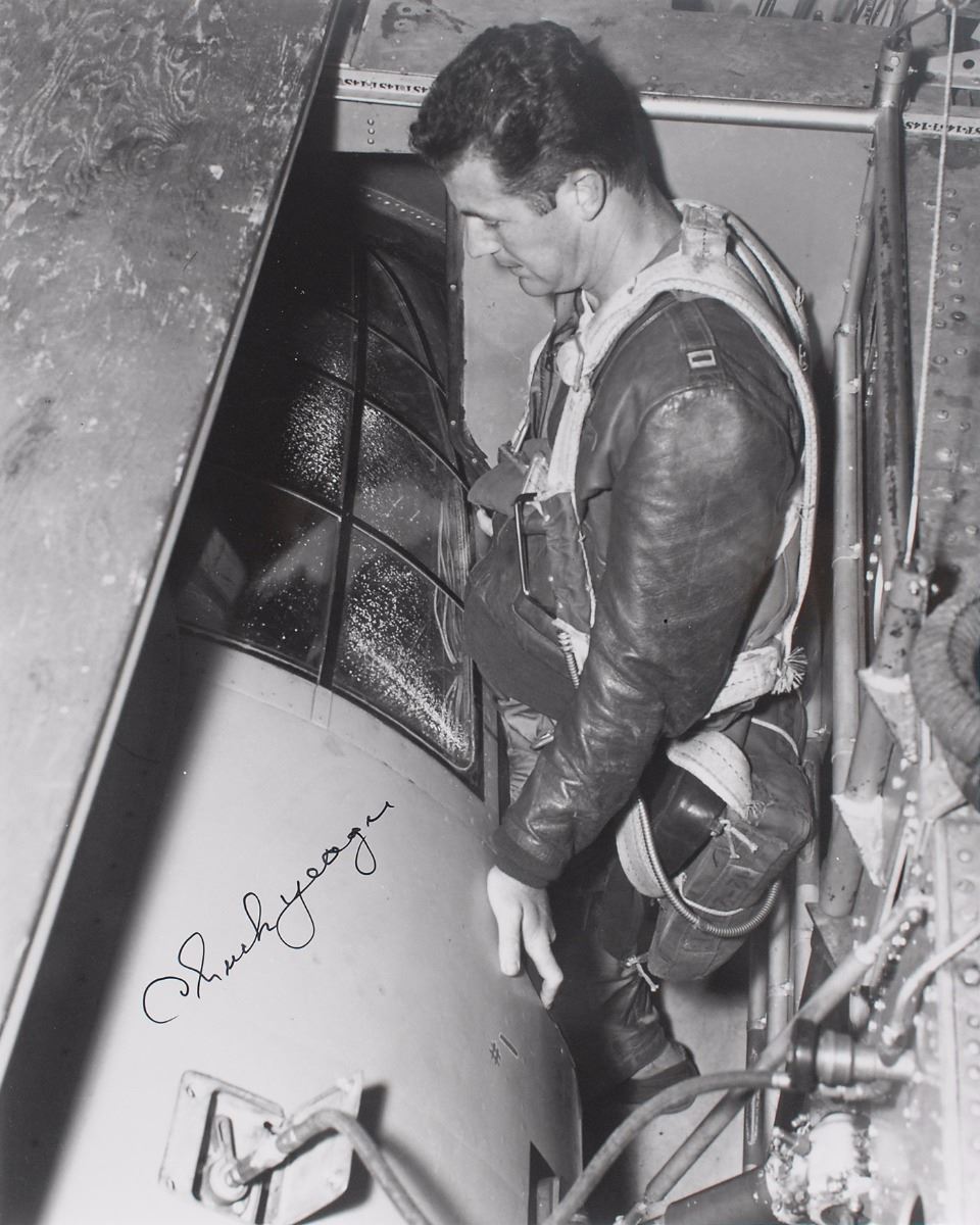 Candid glossy 8 x 10 photo of Yeager leaning against his aircraft, signed in black ink. In fine condition.