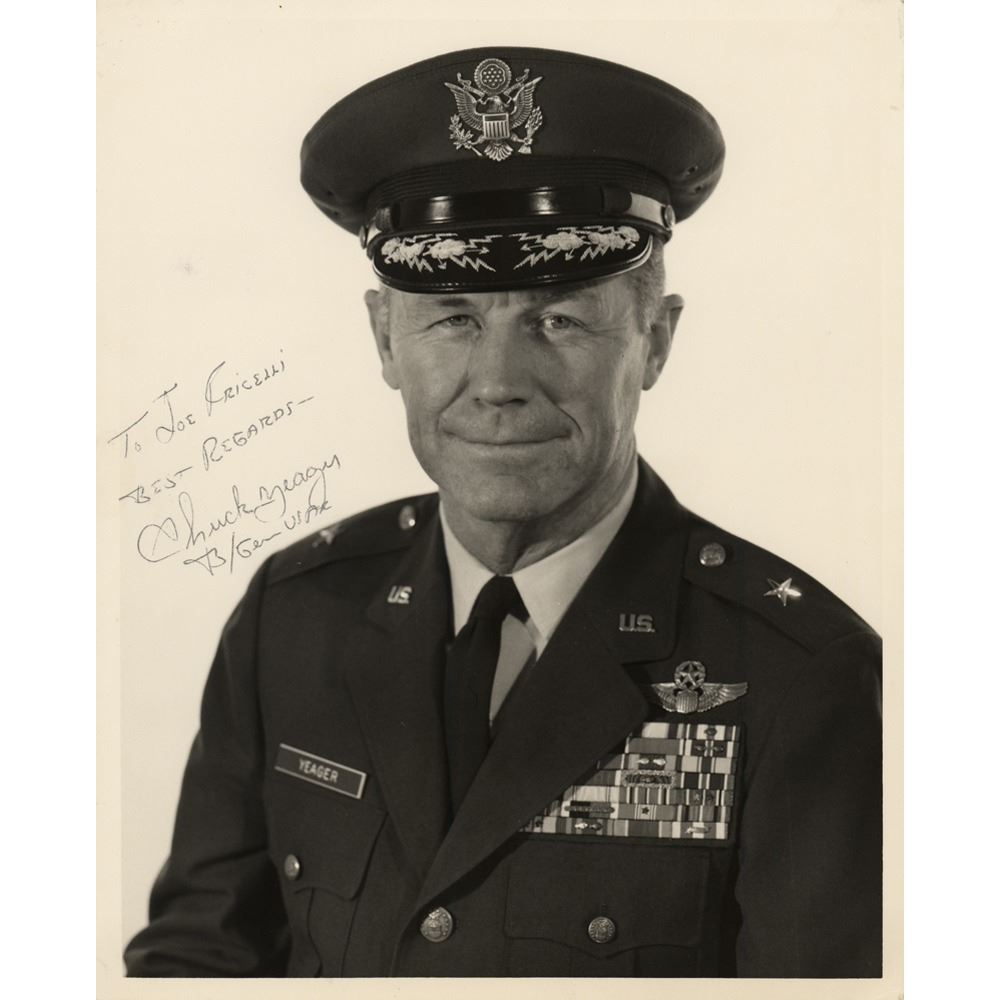 Matte-finish 8 x 10 photo of Yeager in uniform, signed and inscribed in black ballpoint, "To Joe Fricelli, Best Regards—Chuck Yeager, B/Gen USAF.†In fine condition.