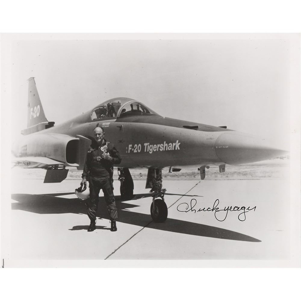Glossy 10 x 8 photo of Yeager posing in front of a Northrop F-20 Tigershark, nicely signed in black felt tip, "Chuck Yeager." In fine condition.