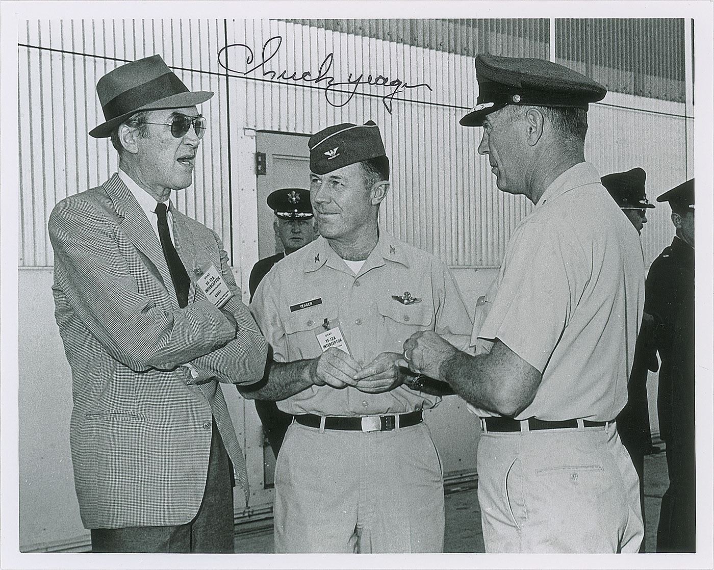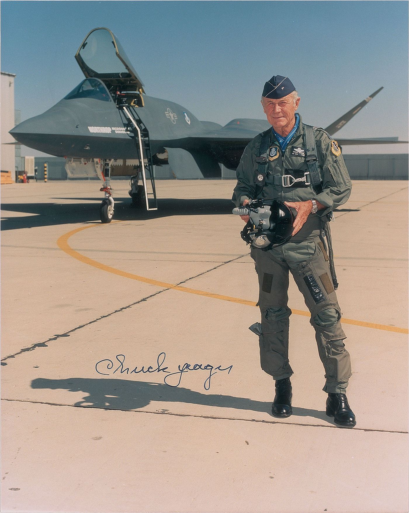 Two photos signed by Yeager: a glossy 10 x 8 photo of him in uniform and wearing a Lockheed YF-12 badge, signed in black felt tip; and a color satin-finish 8 x 10 photo of him in front of a Northrop YF-23, signed in black felt tip. In overall fine condition.