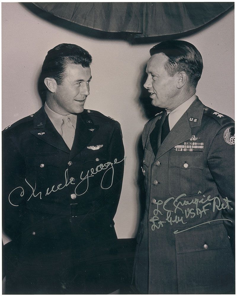 Glossy 8 x 10 photo of Yeager and Craigie conversing while in the service, signed in silver ink, “Chuck Yeager,” and “L. C. Craigie, Lt. Gen USAF Ret.” In fine condition. Craigie was the US Air Force's first jet pilot.