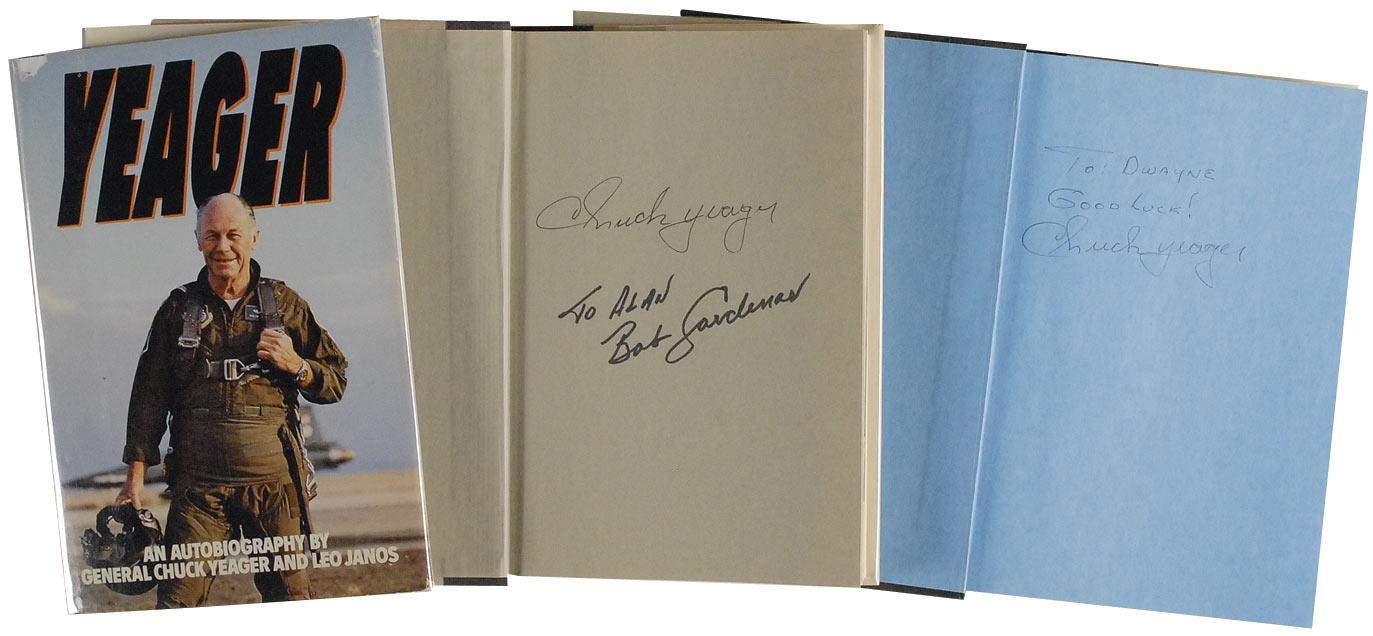 Three hardcover books: two copies of Yeager, one signed on the half-title page and one signed on the first free end page; and Press On!, signed and inscribed on the first free end page. In fine condition, with one signature fairly light, but still legible, gift presentation in one book, and some scattered light wear to dustjackets.